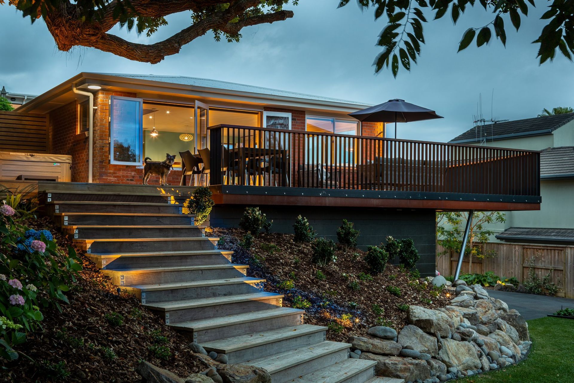 ArchiPro Project Summary - Transformation of a 1960s home into a vibrant, open-plan coastal residence, featuring a spacious curved deck and custom-designed landscaping, joinery, and interiors for a warm and inviting atmosphere.