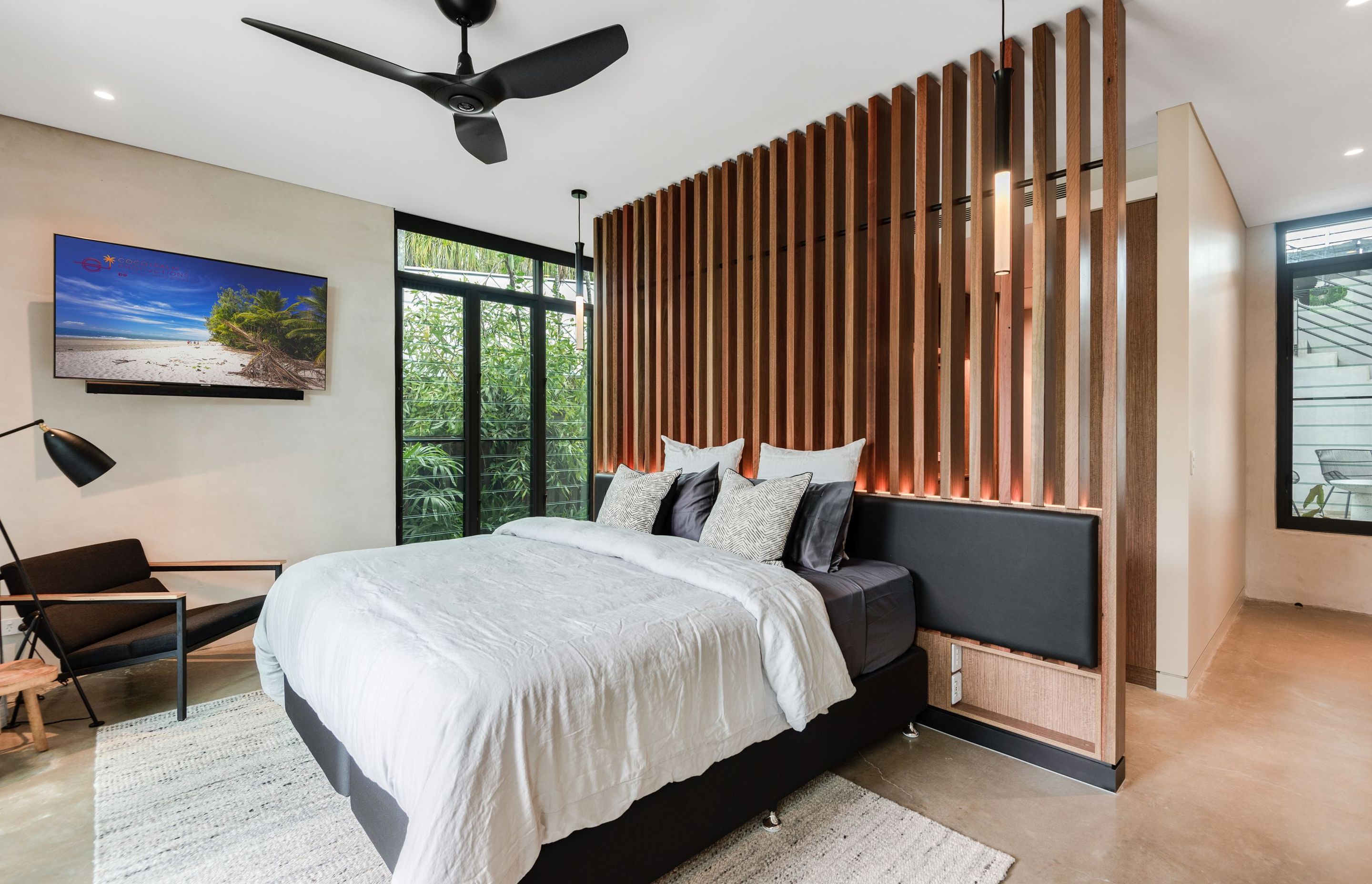 ArchiPro Project Summary - Beachfront Mirage Residence: A contemporary tropical retreat in Port Douglas, featuring three pavilions linked by a central timber boardwalk, rich materials, and two inviting courtyards with a granite pool and a sunken teppanyaki grill area.