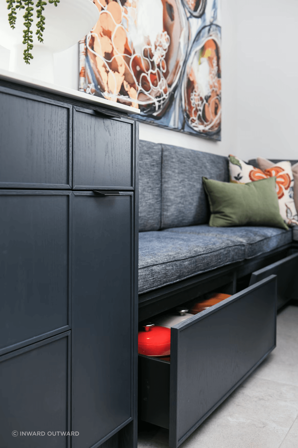 ArchiPro Project Summary - Award-winning Beltrasna Kitchen featuring mood blue cabinetry and innovative storage solutions, designed by Inspired Interiors by Robyn Coté and captured by Inward Outward.