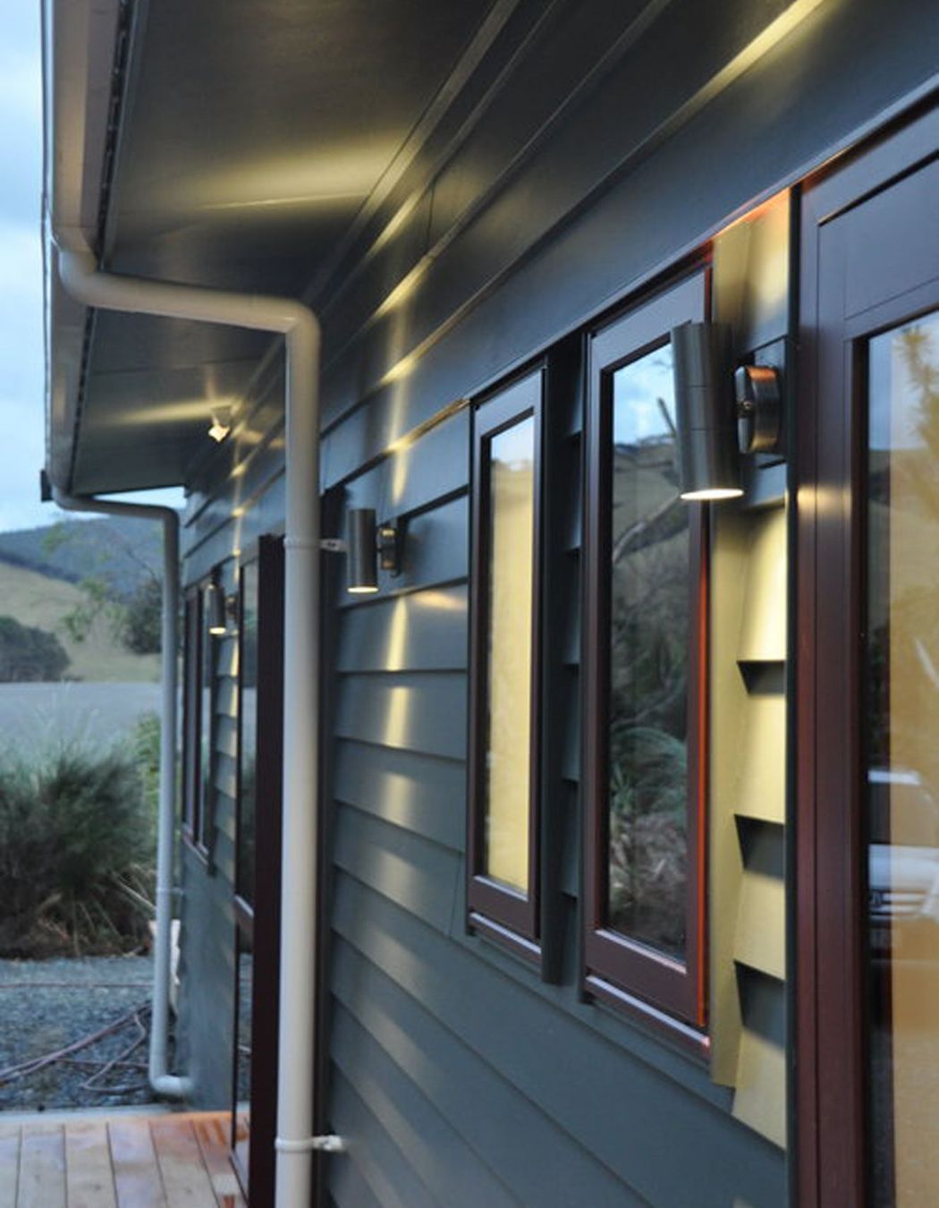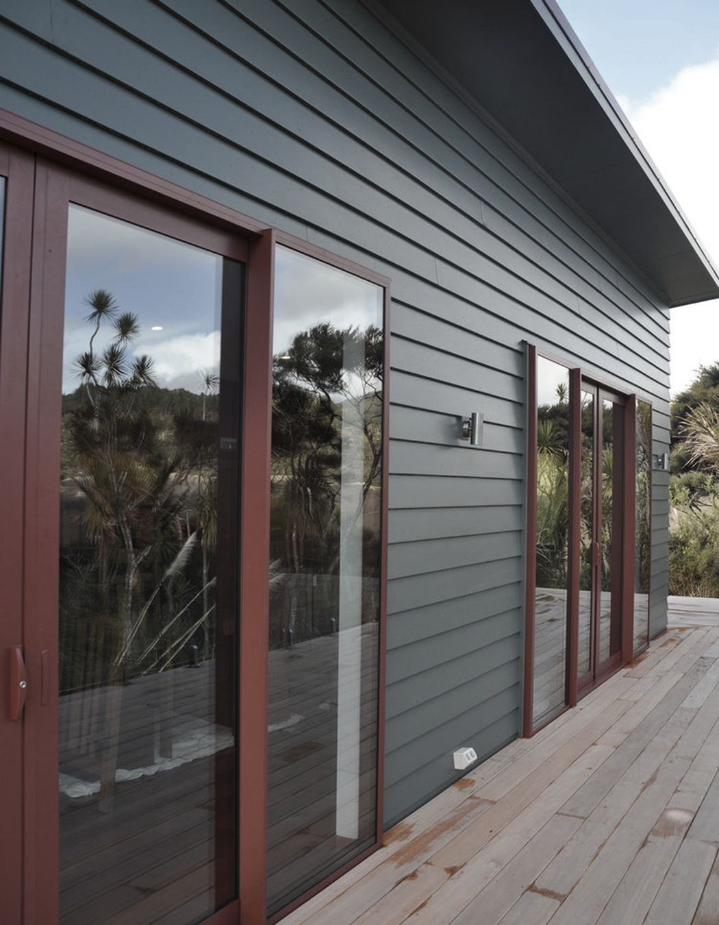 ArchiPro Project Summary - A solar-powered bach designed to maximize views of Bethells black sand dunes, featuring a mono-pitched roof, double glazed joinery, and a reclaimed totara deck with glass balustrade, all while overcoming the challenges of a remote site.