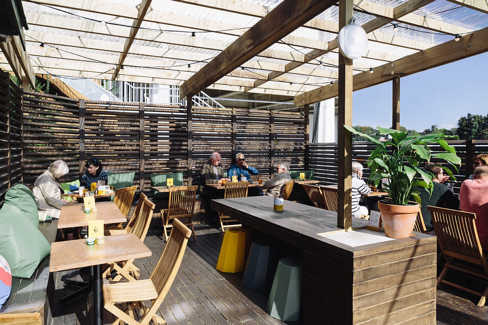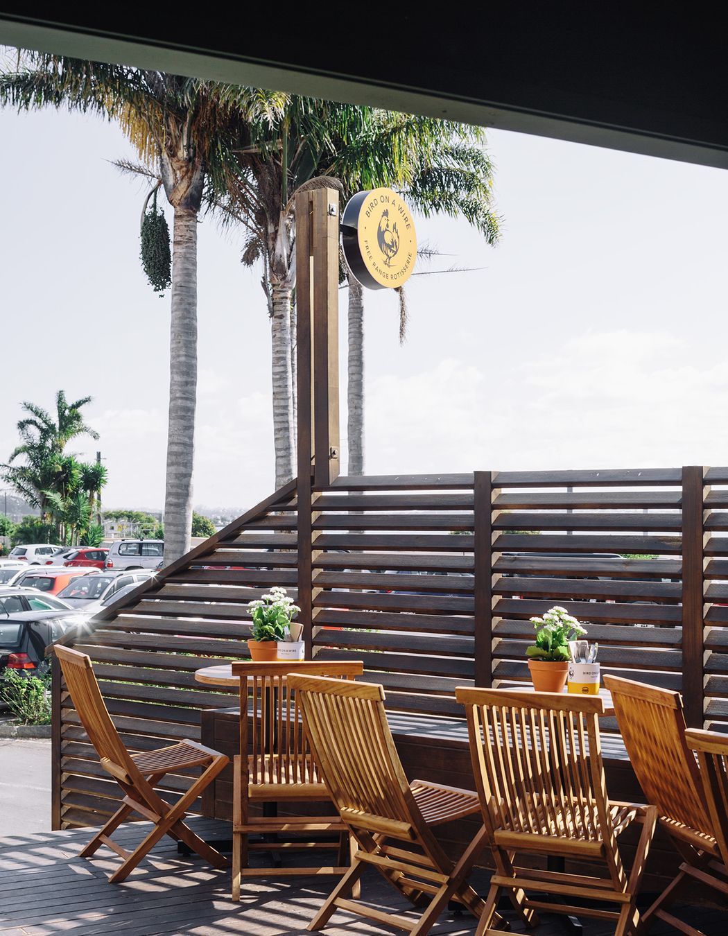 ArchiPro Project Summary - Transformation of an office space into a vibrant free-range chicken restaurant in Orakei Bay Village, featuring a new covered deck, extensive commercial kitchen, and warm modern aesthetics with brass detailing and LED lighting.