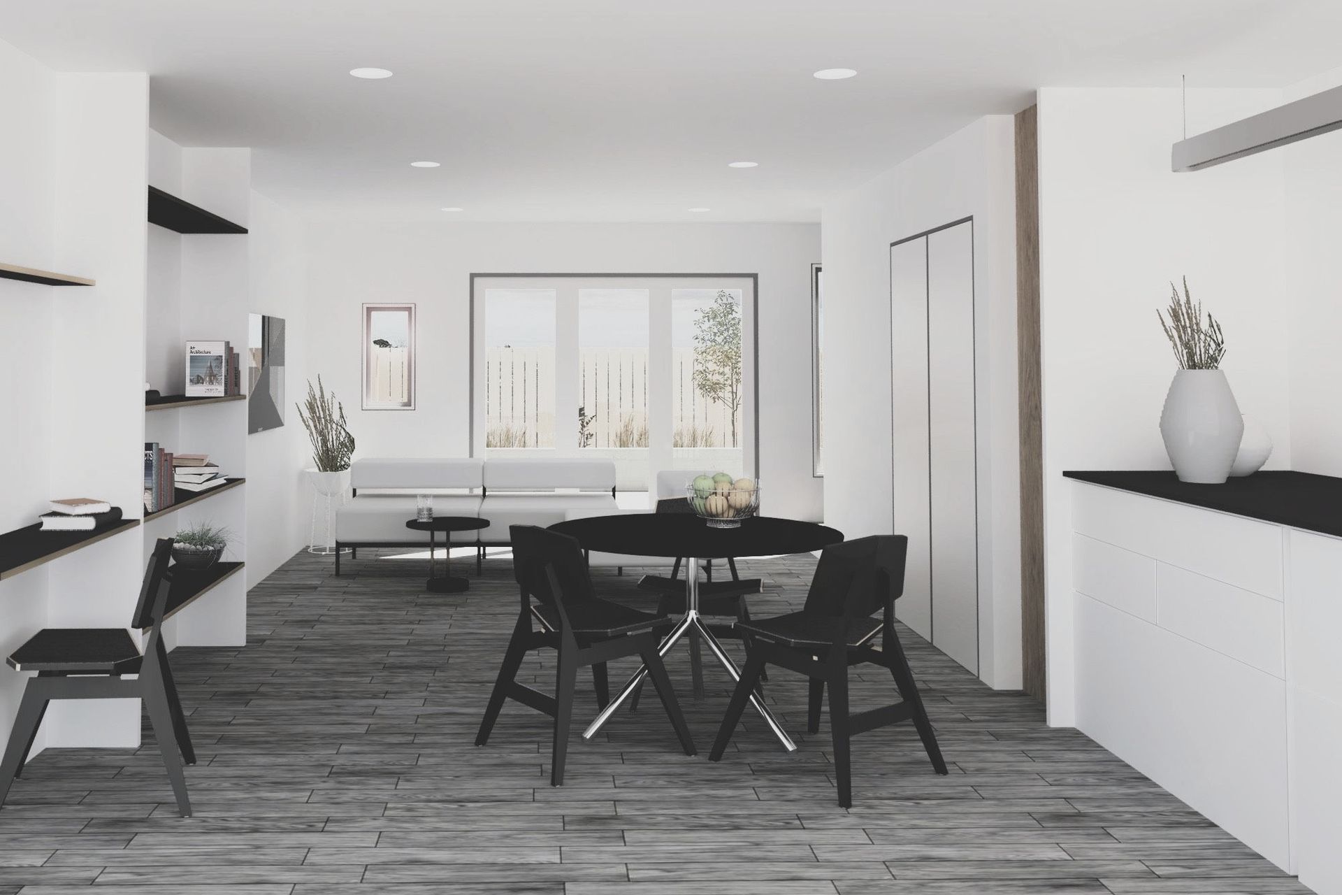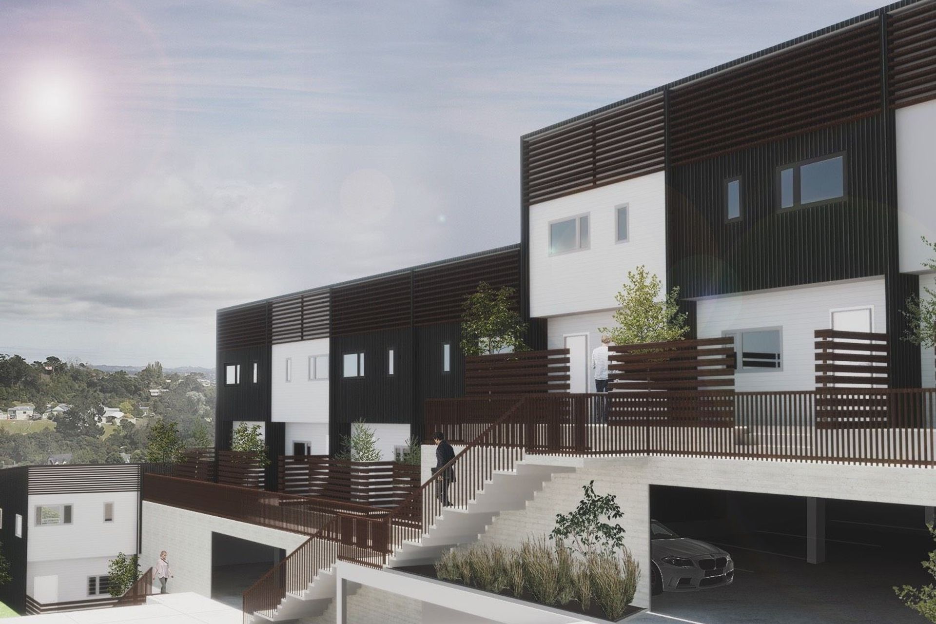 ArchiPro Project Summary - A collaborative development of 19 prefabricated townhouses featuring a blend of black MC770 cladding and white linear weatherboard, designed for optimal interior and exterior spaces, including front and back yards, two living levels, and a storage loft.