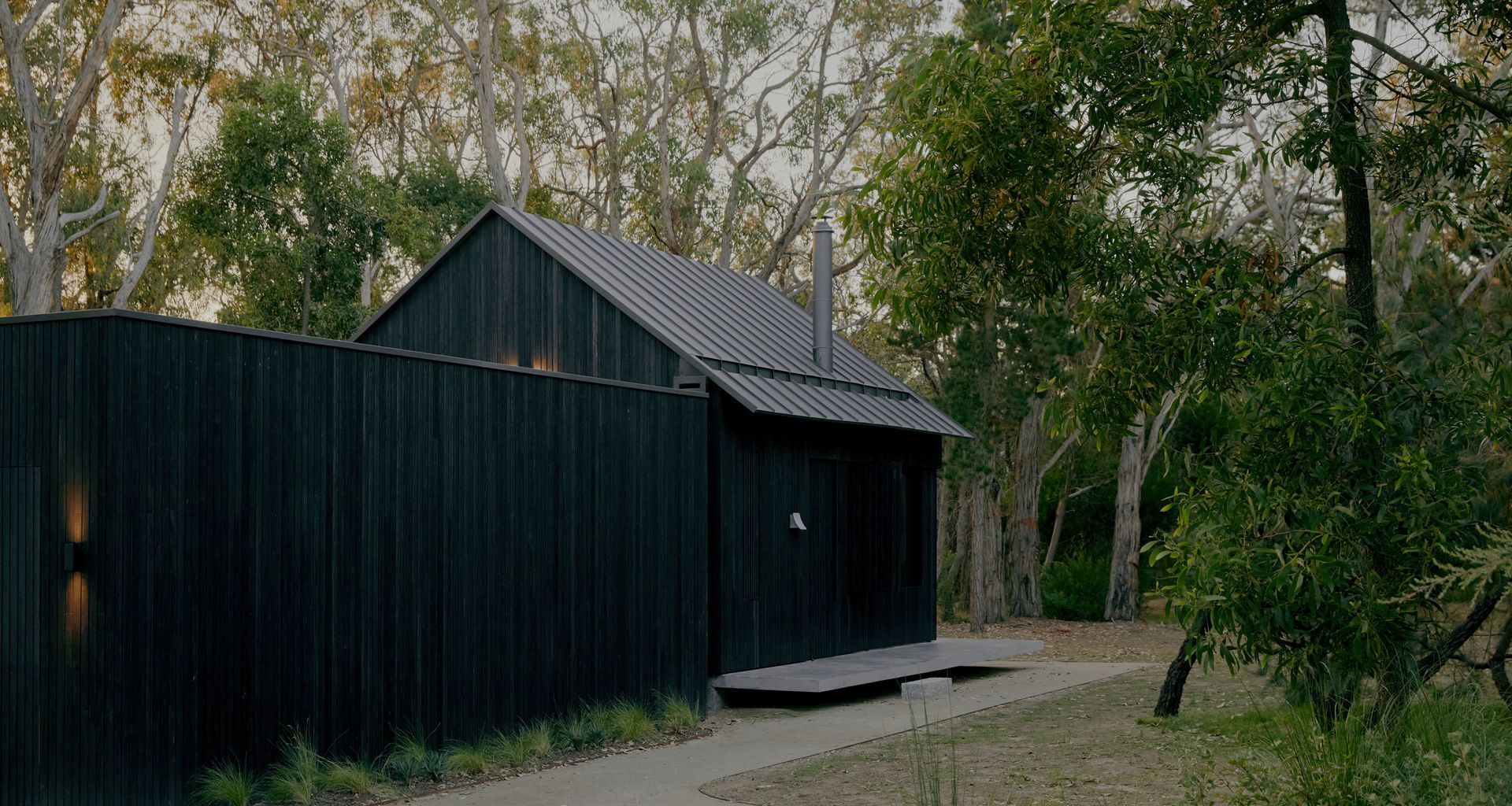 ArchiPro Project Summary - A charred timber clad cabin nestled in the lowland forest of Bunurong Country, designed by Nic Morgante and constructed by Dynes Eco Build, completed in 2024.