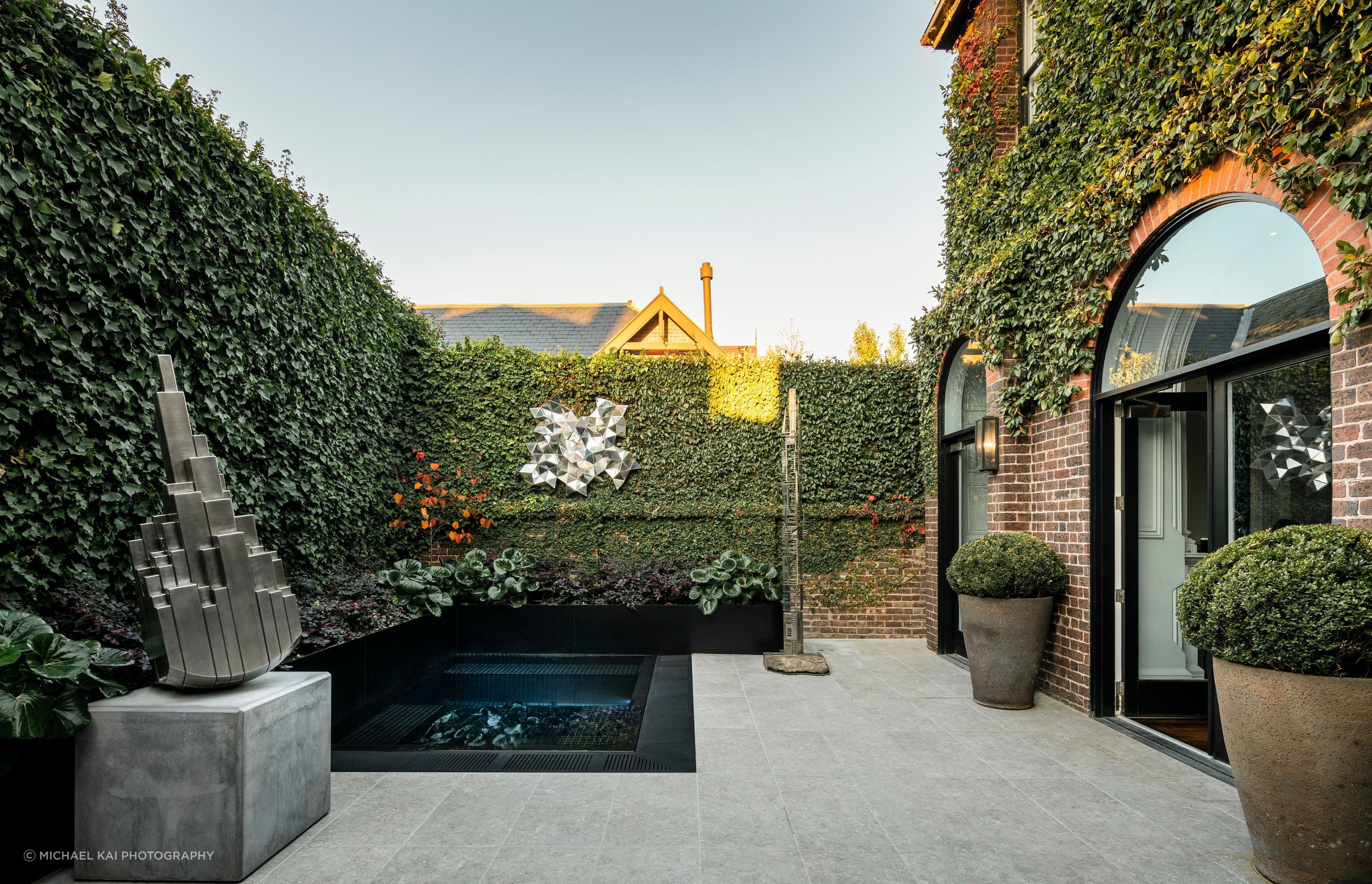 ArchiPro Project Summary - A stunning renovation of a heritage-listed home featuring a contemporary swimming pool and courtyard, designed to harmonize with surrounding sculptures and enhance the overall aesthetic.