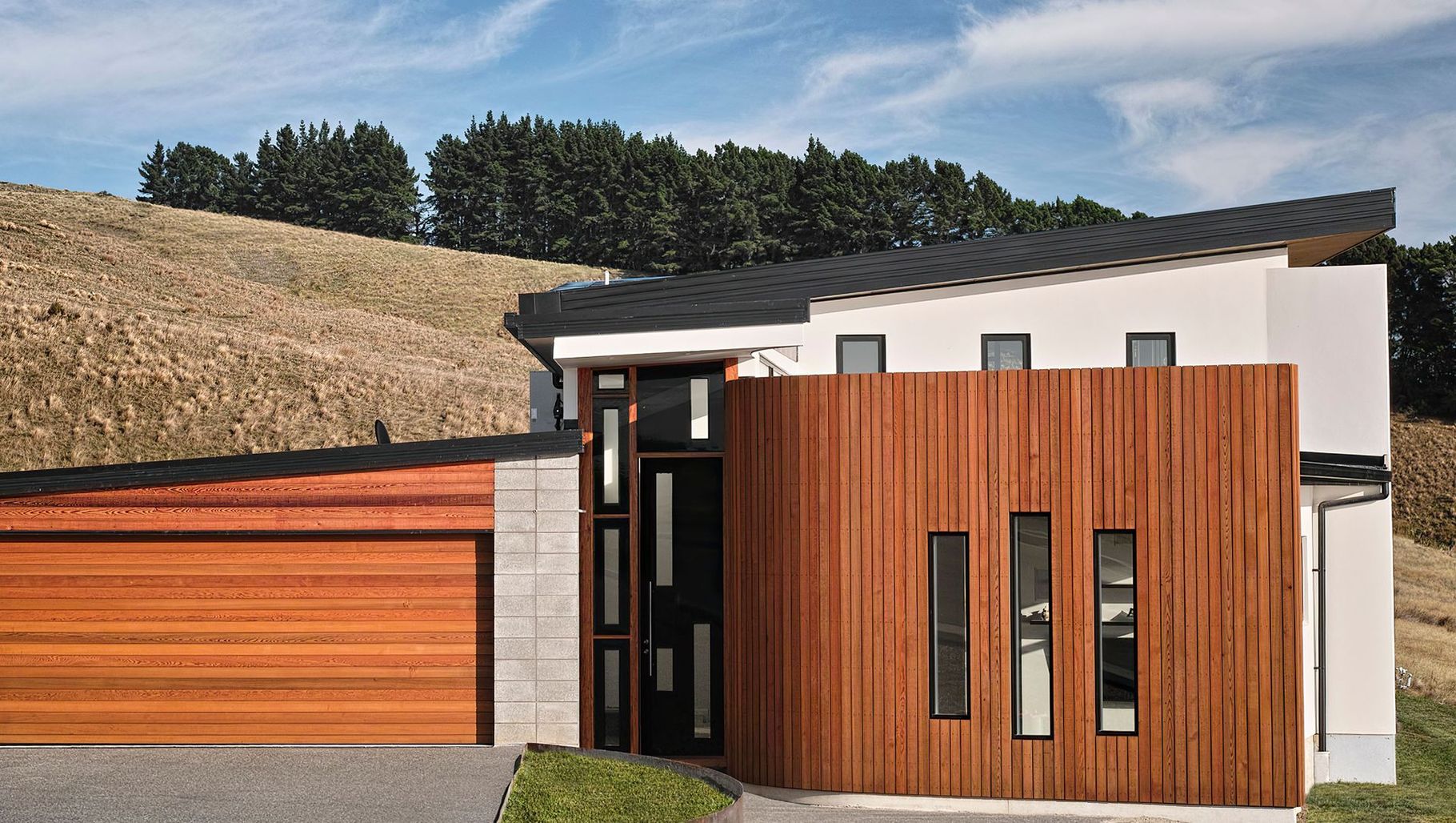 ArchiPro Project Summary - Award-winning Black Door House, designed by MC Architecture Studio, features a striking three-form structure with a winged roof, floor-to-ceiling glazing, and exposed steel elements, all while prioritizing energy efficiency and quality construction.