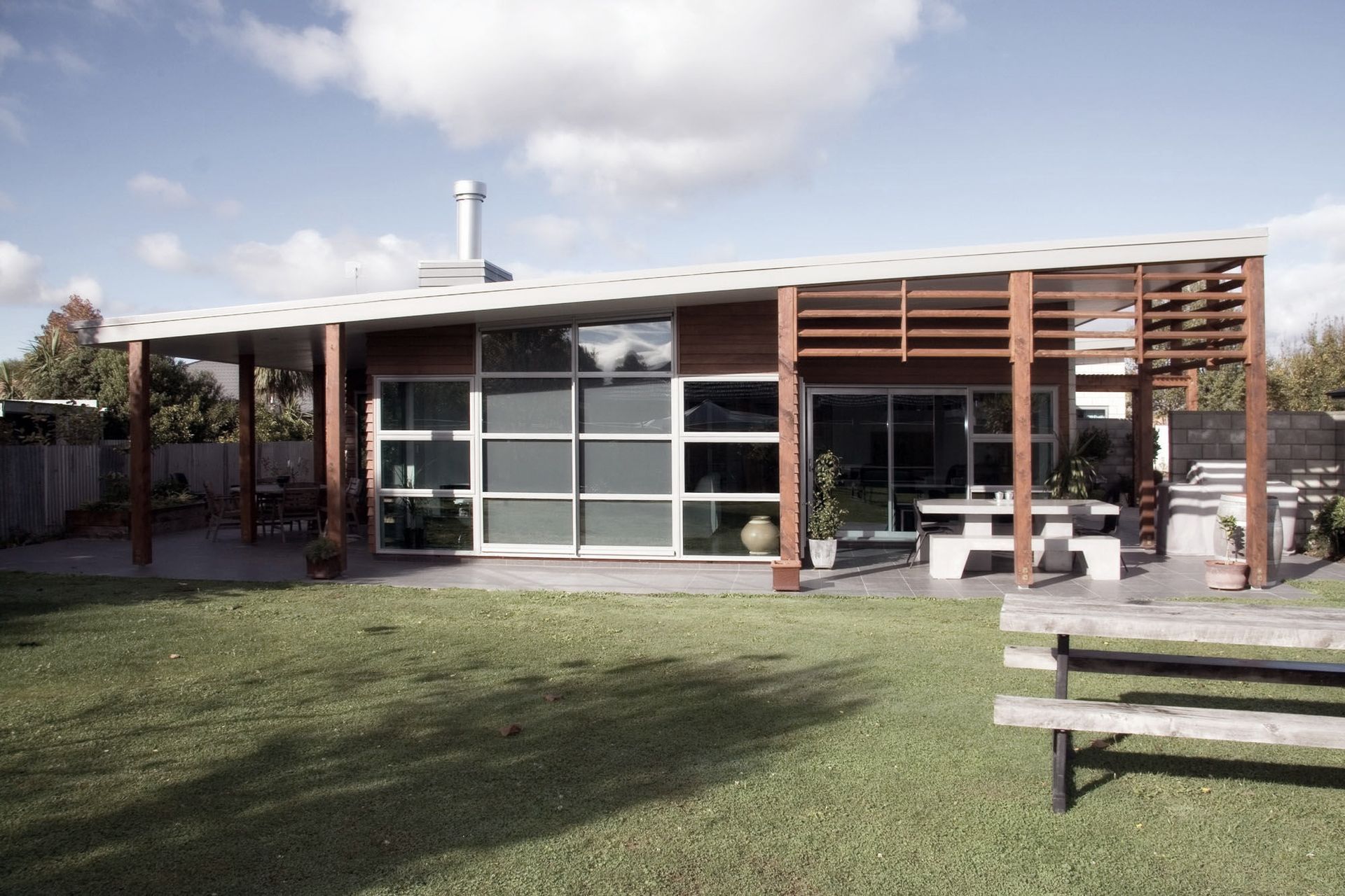ArchiPro Project Summary - A modern, sustainable home designed for the hot, dry climate, featuring passive solar heating, a Trombe wall, and versatile indoor-outdoor living spaces, all while balancing complexity with a simple mono-pitched roof.