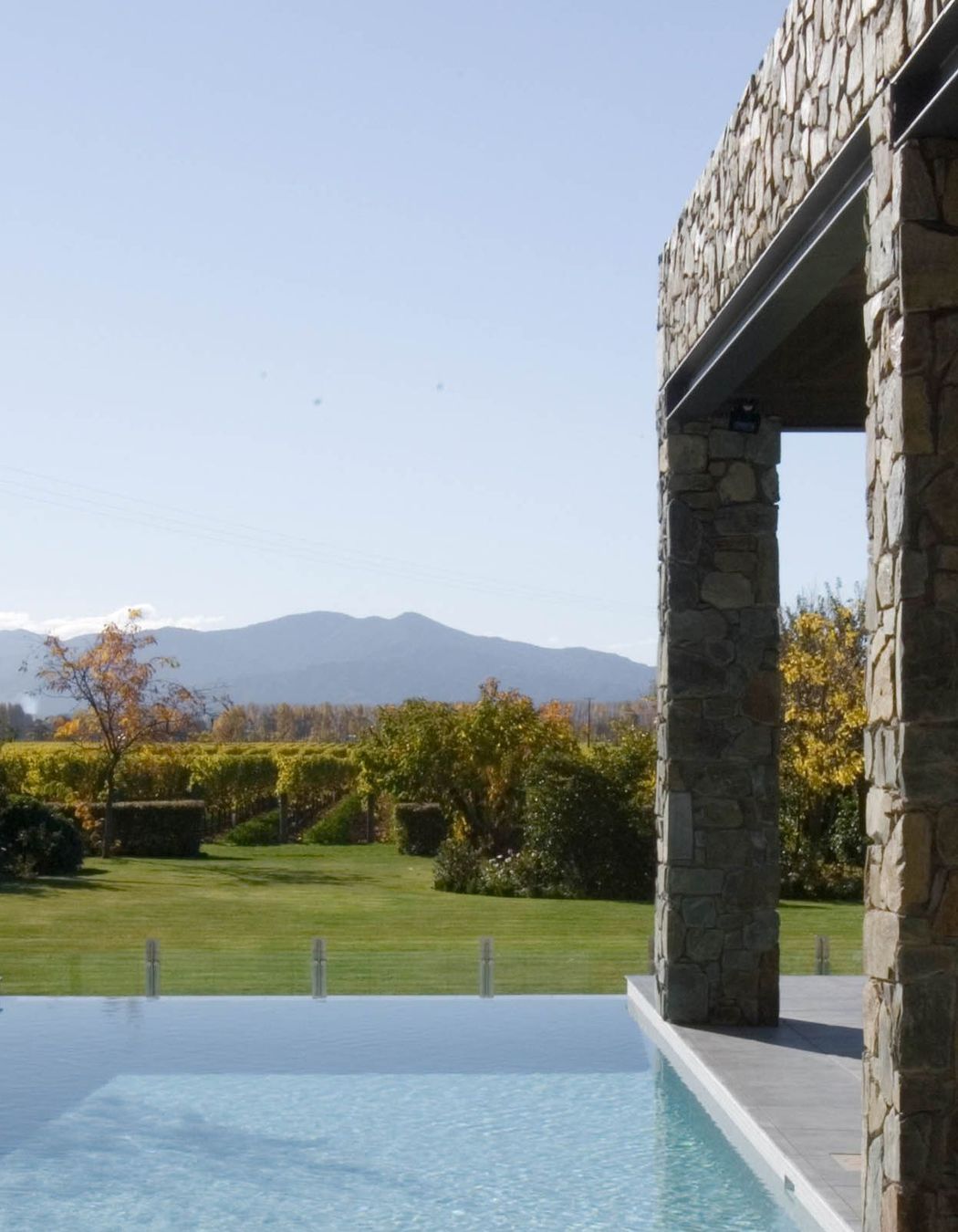 ArchiPro Project Summary - A contemporary home featuring a blend of traditional materials, including steel and locally-quarried stone, complemented by extensive glass elements and a striking timber-framed upper floor beneath a long run steel roof.