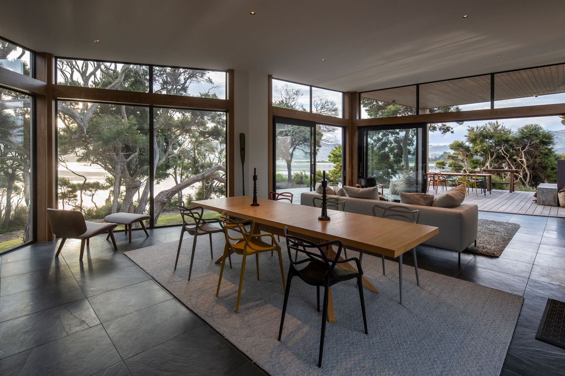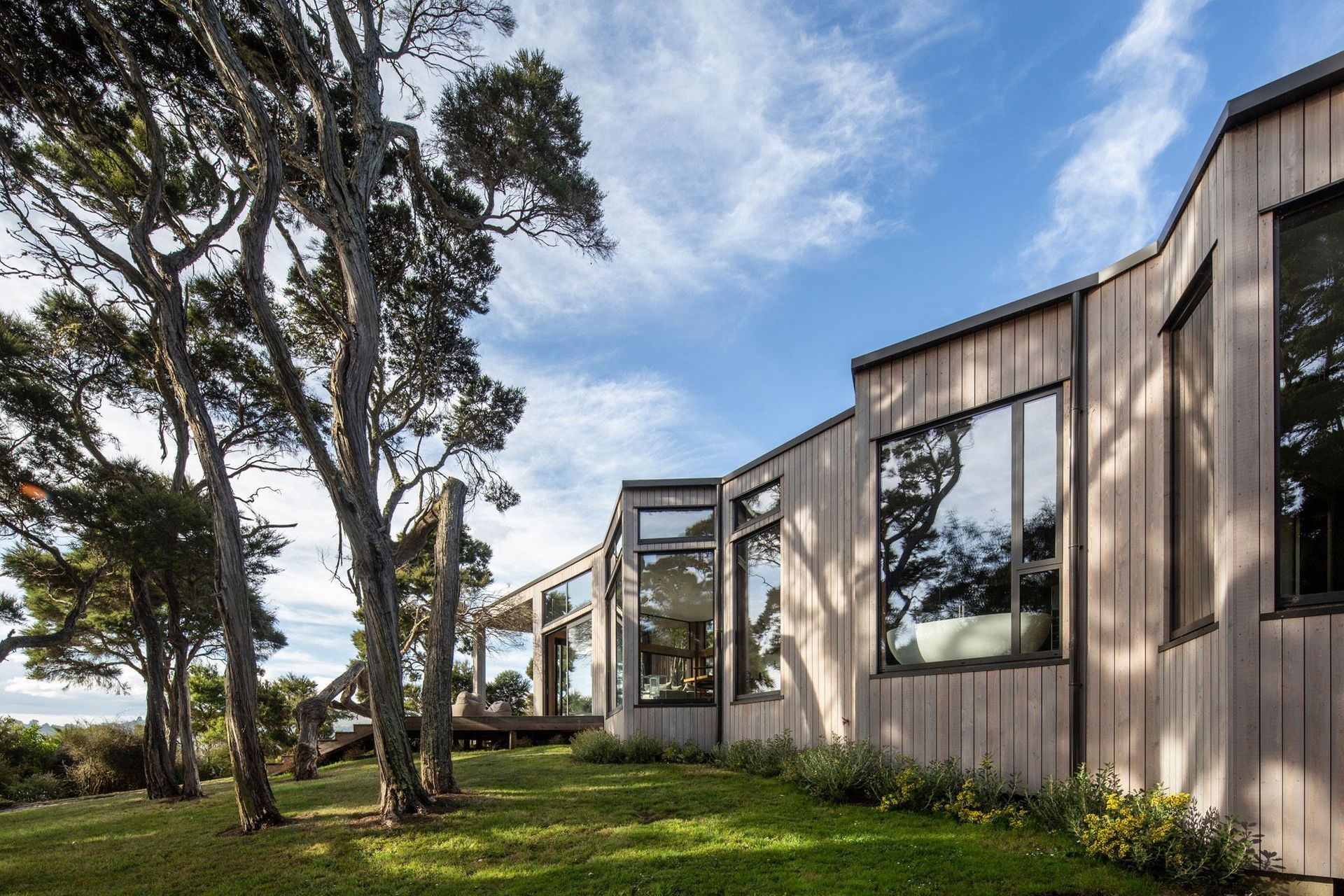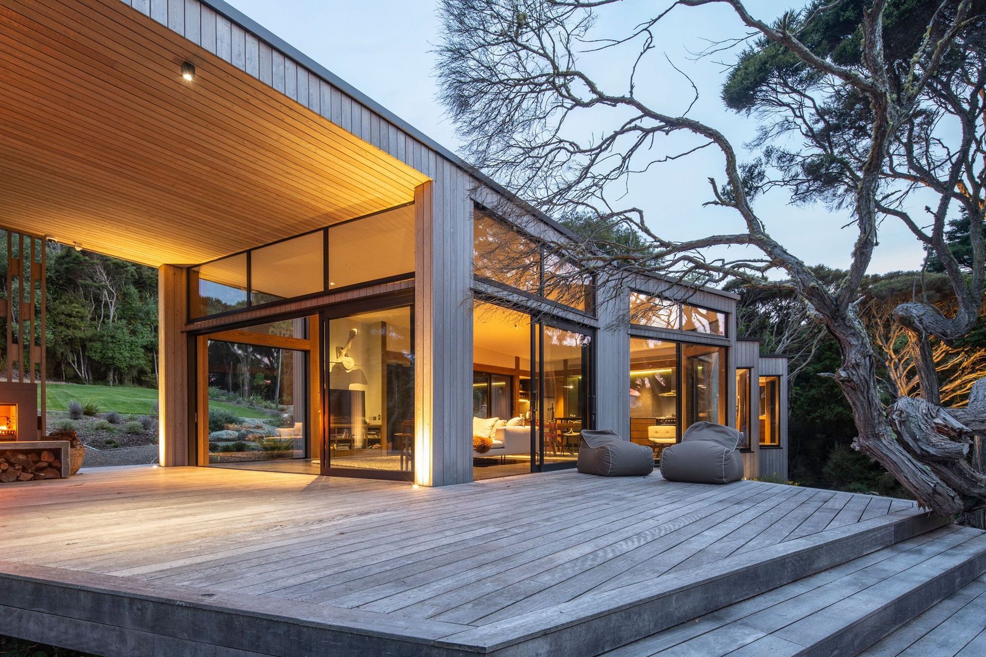 ArchiPro Project Summary - Contemporary retreat overlooking Blueskin Bay, harmoniously integrated with nature and crafted from wood, featuring unique angulated walls that enhance the interaction between interior and exterior spaces.