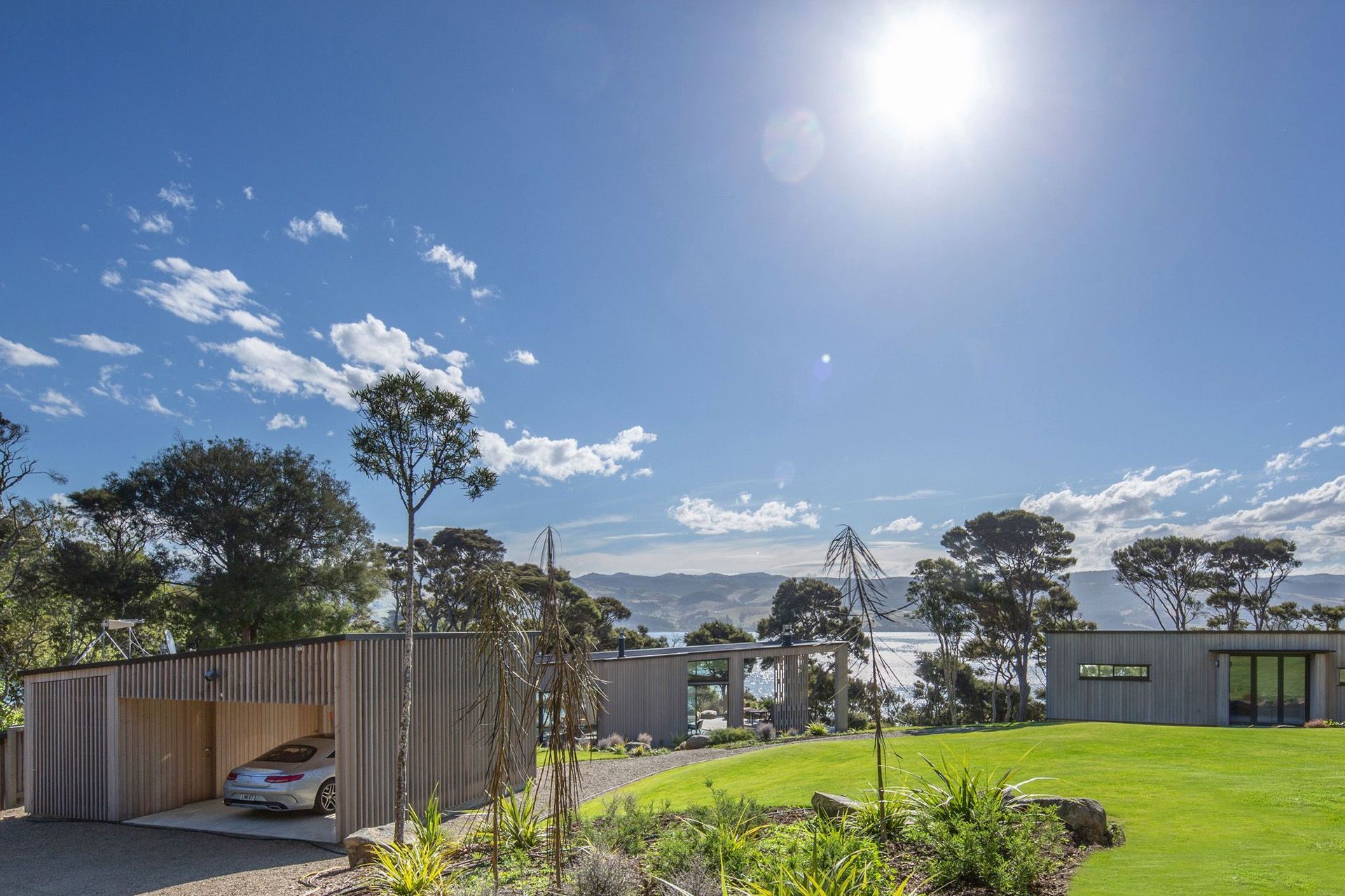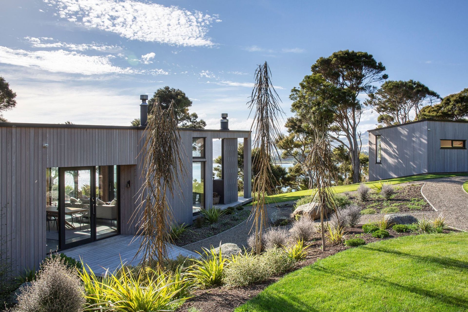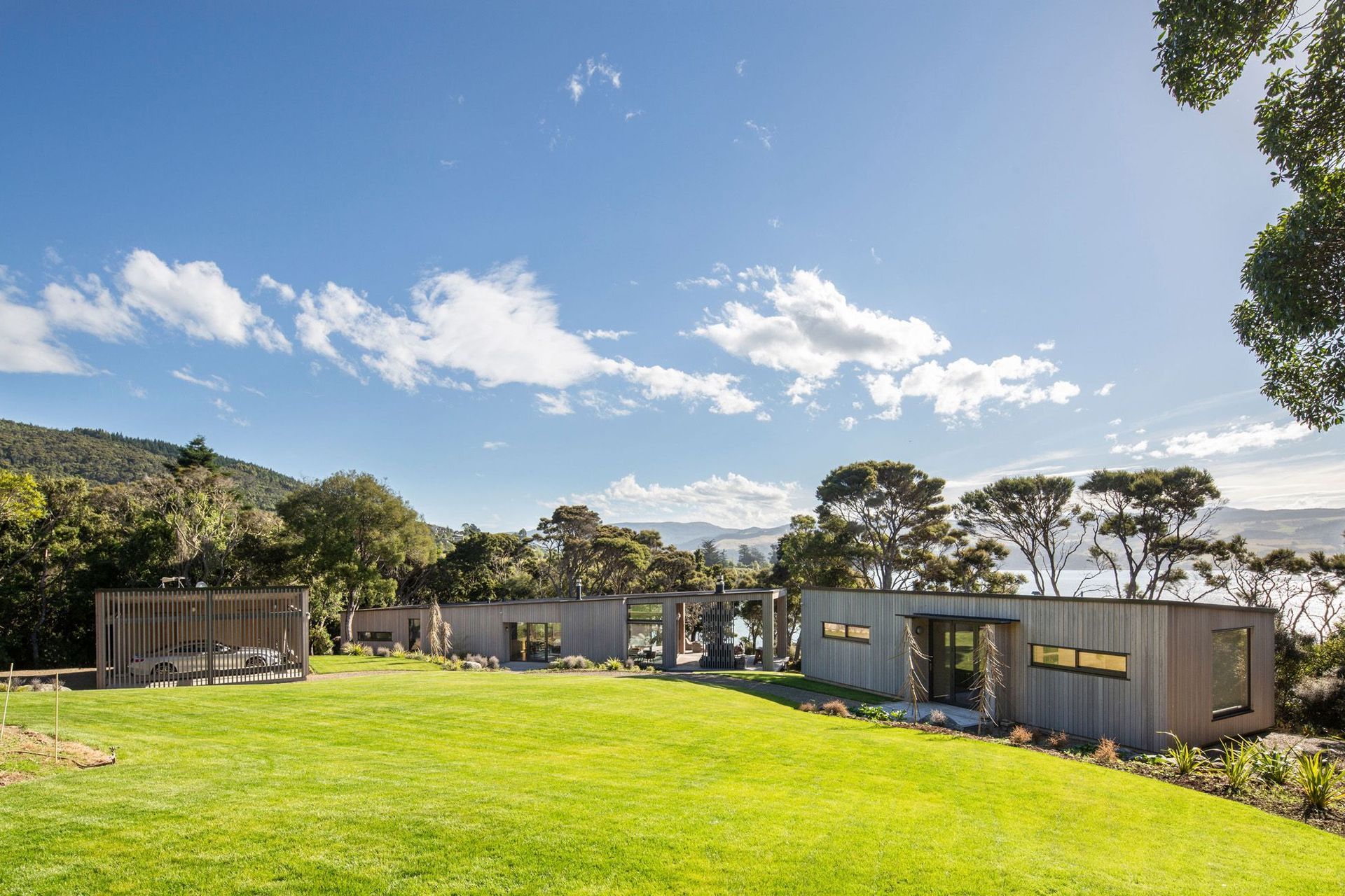 ArchiPro Project Summary - Contemporary retreat overlooking Blueskin Bay, harmoniously integrated with nature and crafted from wood, featuring unique angulated walls that enhance the interaction between interior and exterior spaces.