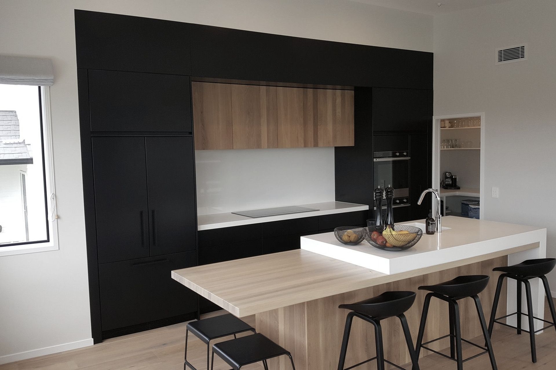 ArchiPro Project Summary - A striking blend of bold aesthetics and minimalism, featuring Primestone engineered stone surfaces and elegant American oak accents, designed to create a seamless flow from the window wall to the pantry door.