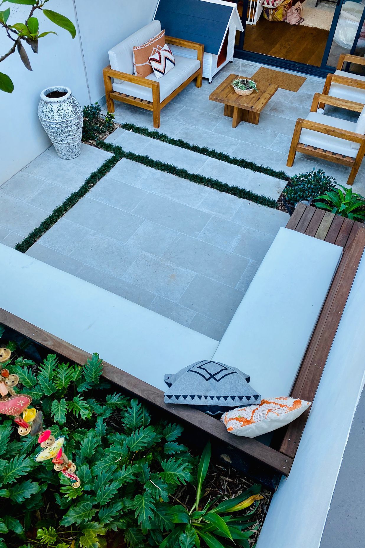ArchiPro Project Summary - A beautifully designed Bondi Courtyard featuring versatile seating areas, lush planting, and a harmonious blend of modern simplicity and classic aesthetics, enhancing the outdoor living experience while complementing the recent interior renovation.