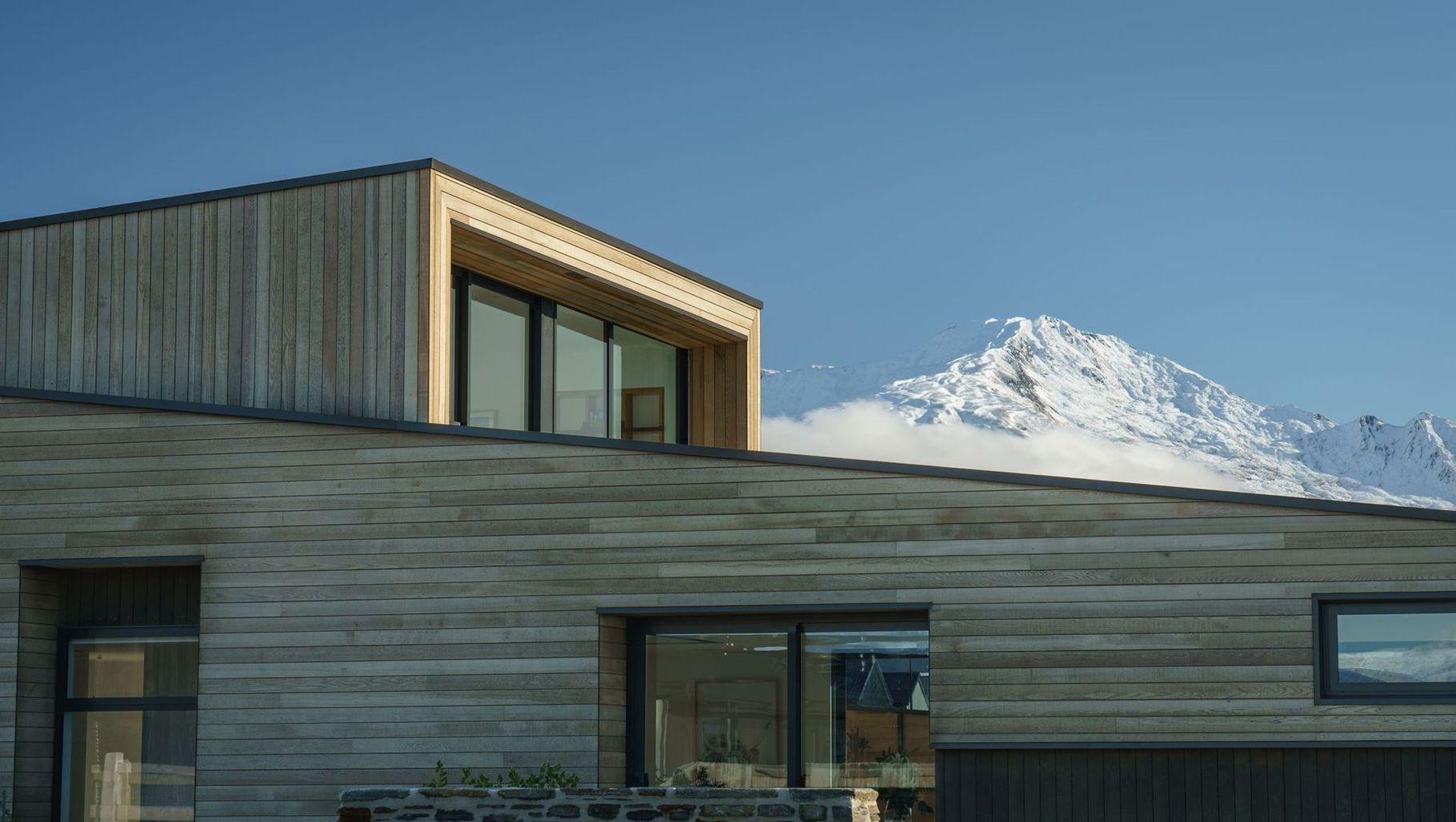 ArchiPro Project Summary - A stunning family residence in Wanaka, designed to embrace alpine views and privacy, featuring a unique wedge shape, warm cedar cladding, and a striking double-height foyer with a library, complemented by a private courtyard for outdoor enjoyment.