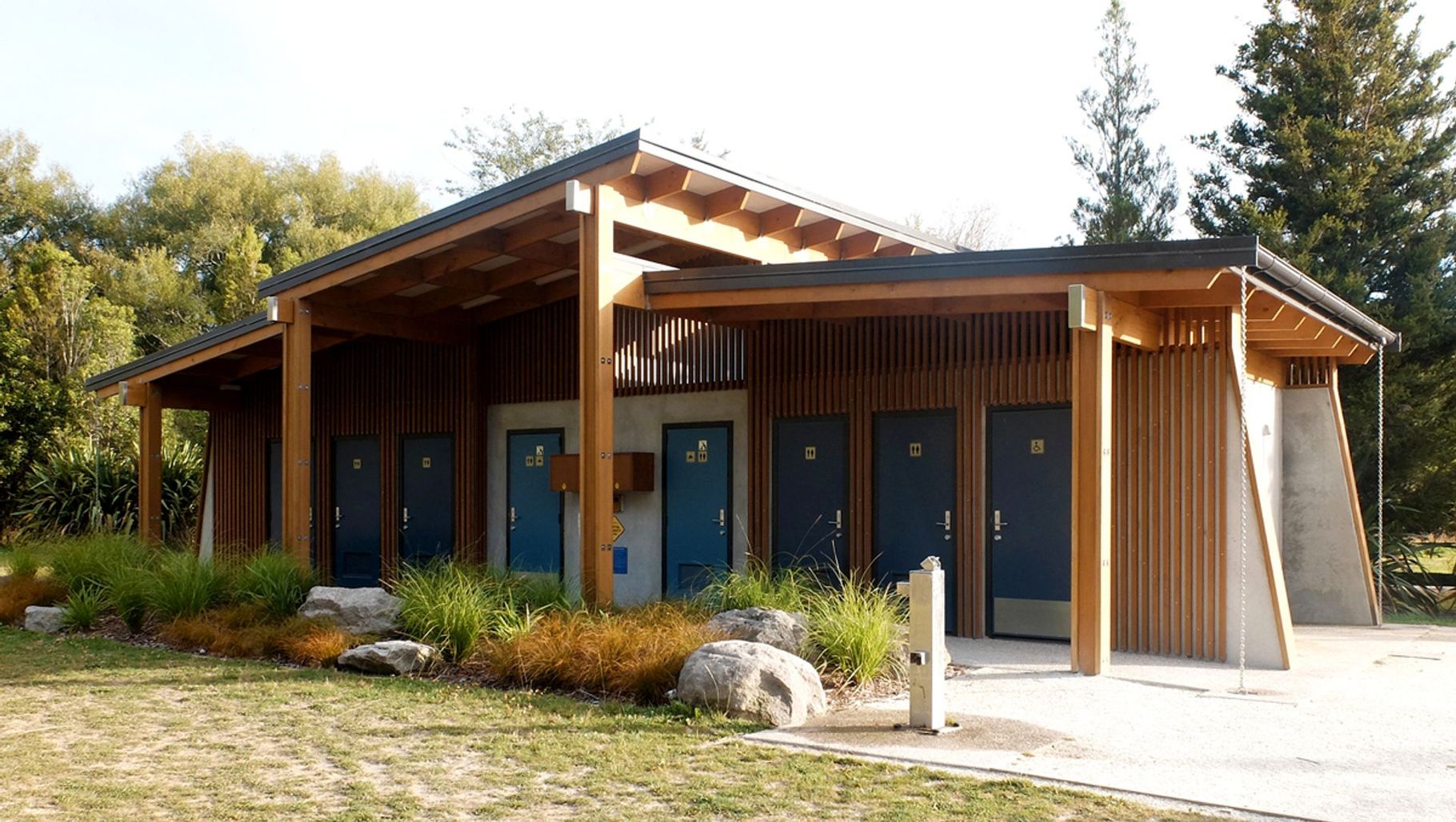 ArchiPro Project Summary - New toilet and shower facilities at Boyes Beach, Lake Okareka, designed by Bishop Architecture and constructed by GRB Construction, featuring family rooms, showers, and eco-friendly amenities to enhance community use and protect local biodiversity.