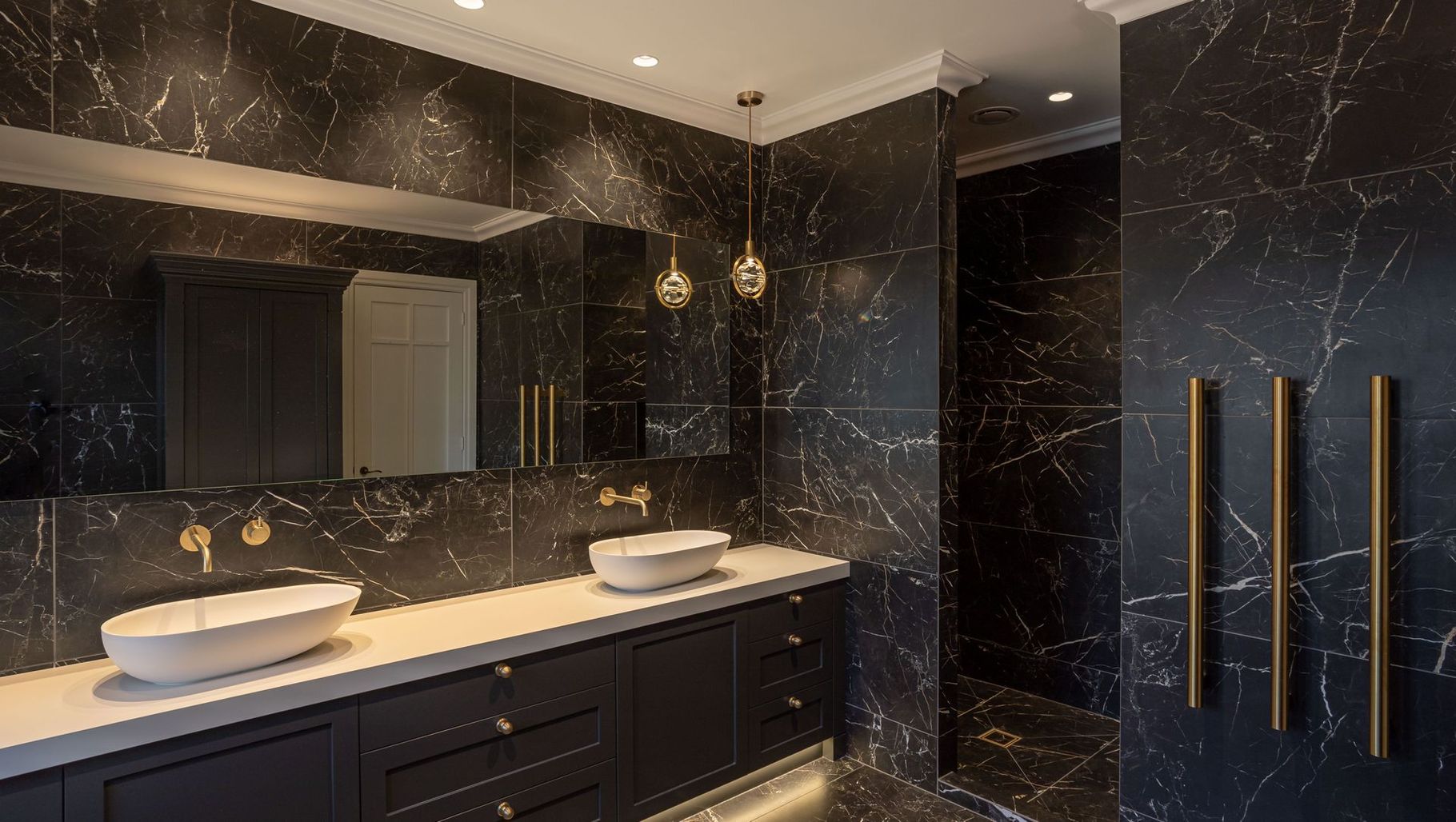 Central to the design concept was the selection of large-format, Italian-made tiles in a striking black, marbled with white and bronze. These were laid from floor to ceiling and complemented with a black vanity and custom cabinetry that offered much-desired extra storage.