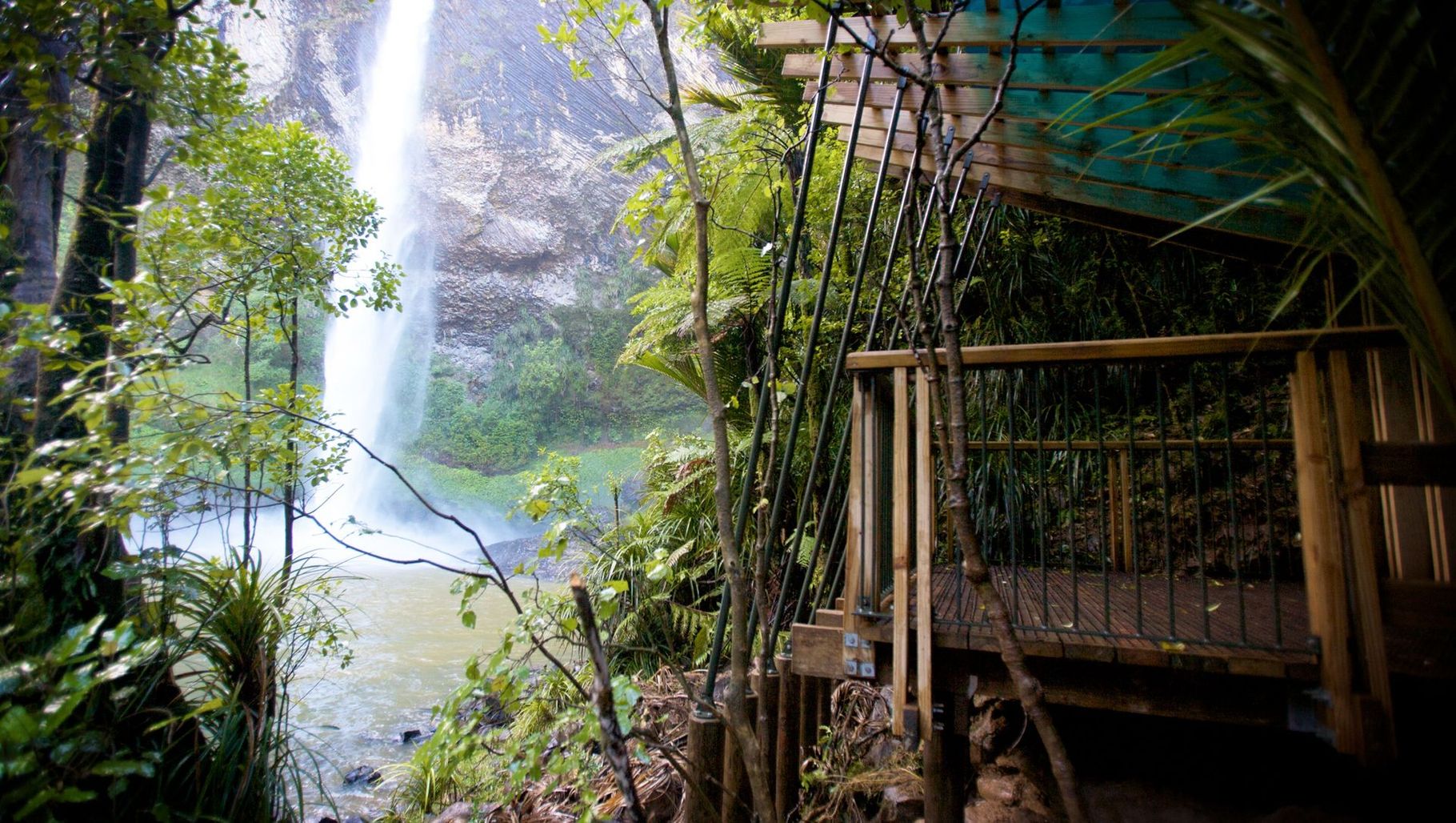 ArchiPro Project Summary - A sculptural viewing shelter at Bridal Veil Falls, designed for the Department of Conservation to enhance accessibility and environmental awareness, featuring a twisted roof and natural materials that invite visitors to experience the beauty of the waterfall.