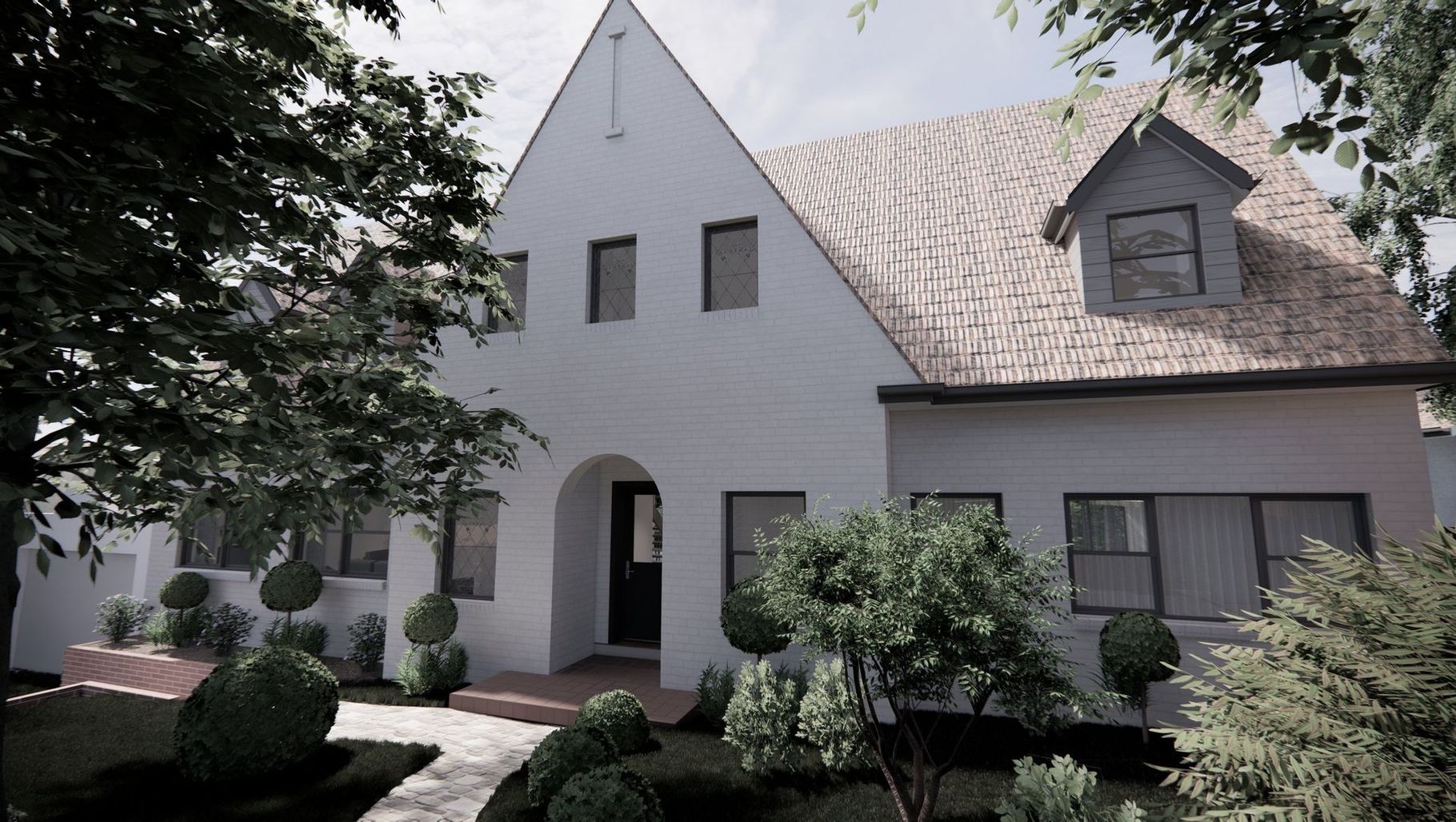 ArchiPro Project Summary - A modern extension and renovation of a Tudor revival home, enhancing its dramatic roof profile while integrating a light-filled entertainment area with stunning views of the garden and Yarra parklands.