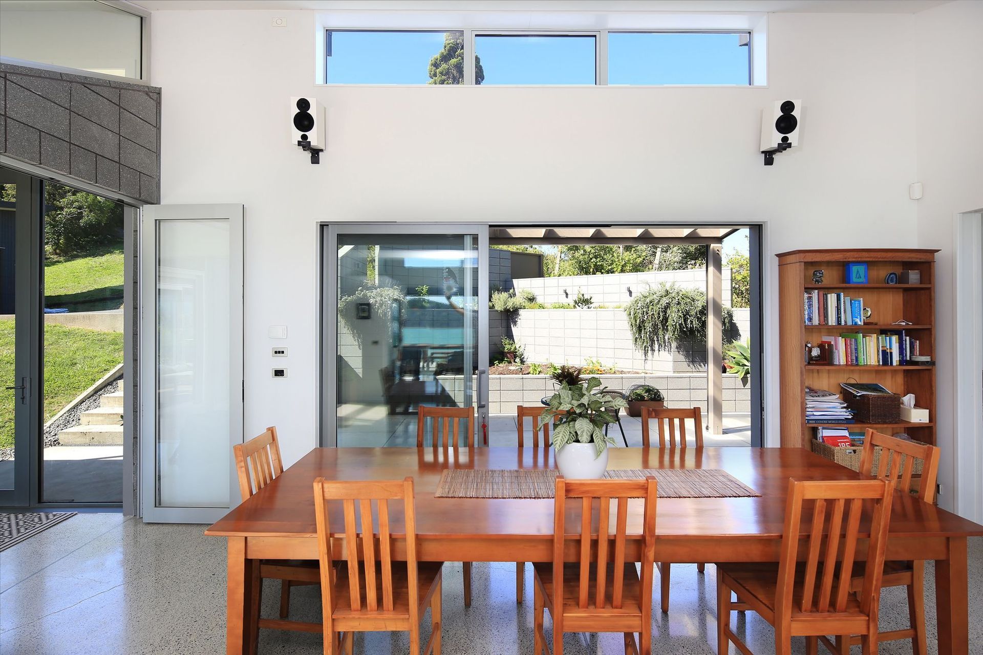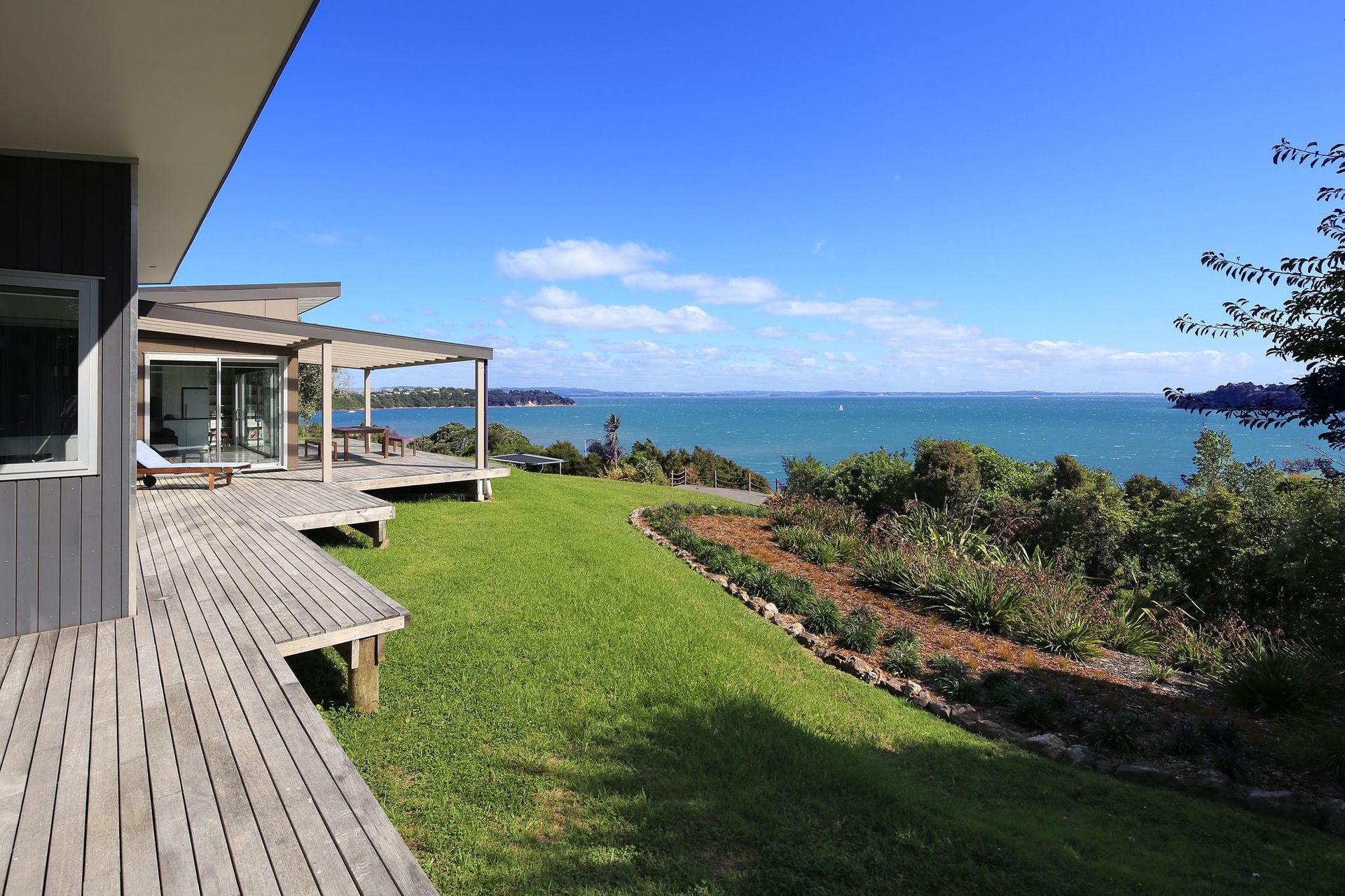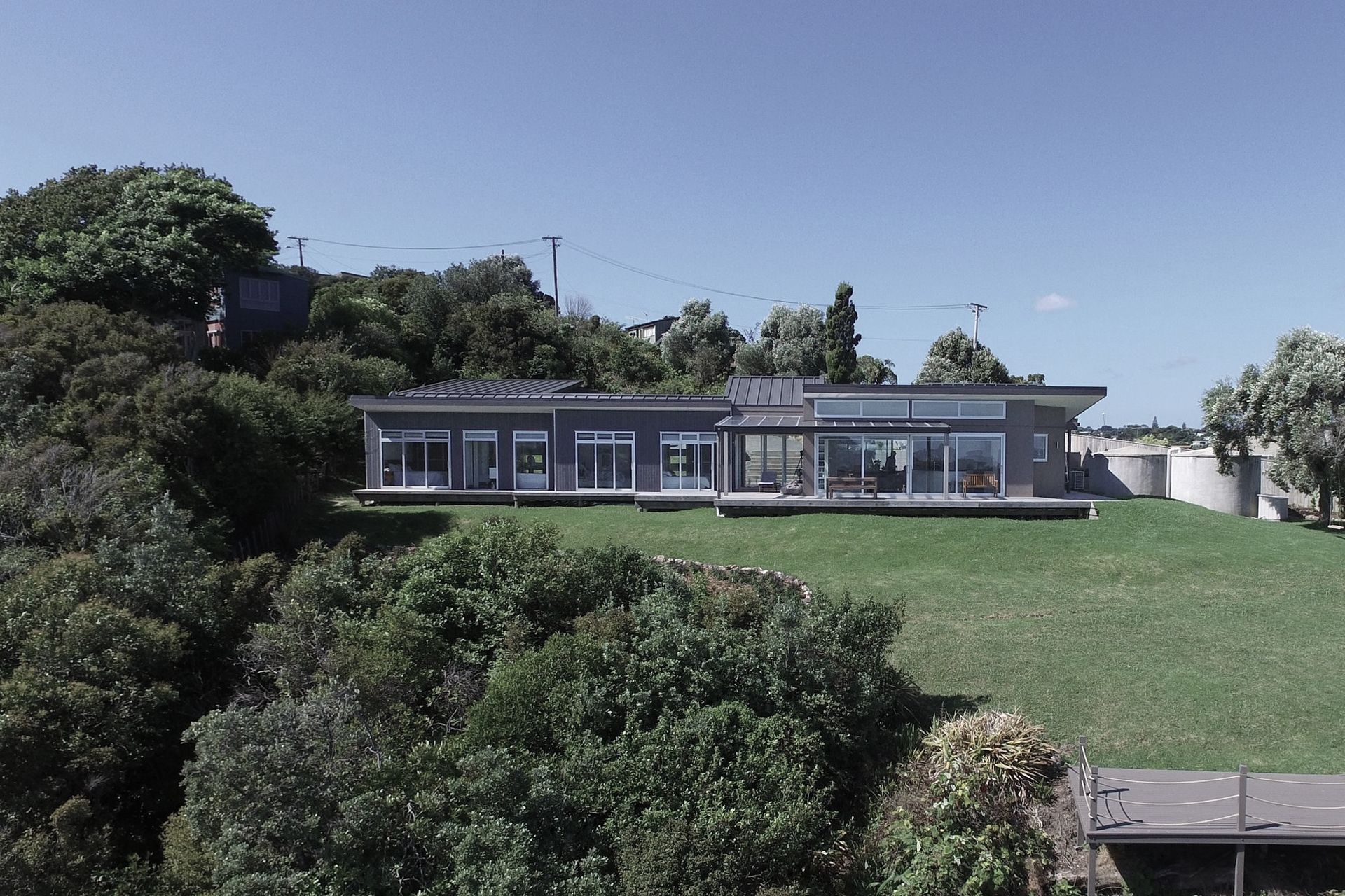ArchiPro Project Summary - A stunning 4-bedroom home on Waiheke Island, featuring a gullwing roof design that maximizes sea views and passive solar benefits, complemented by a spacious living area, protected outdoor spaces, and sustainable building practices for a healthy living environment.