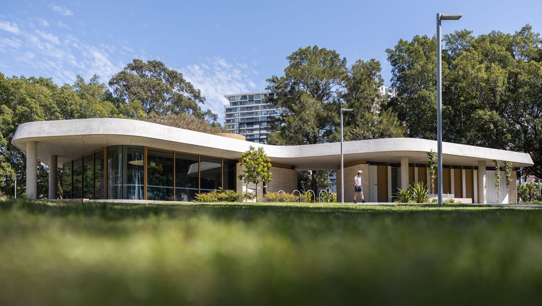 ArchiPro Project Summary - Cahill Park Amenities & Café: A contemporary facility completed in 2021, designed by HAYBALL to enhance the Wolli Creek area, providing a welcoming gateway to the park while offering refuge and stunning views of the Cooks River.
