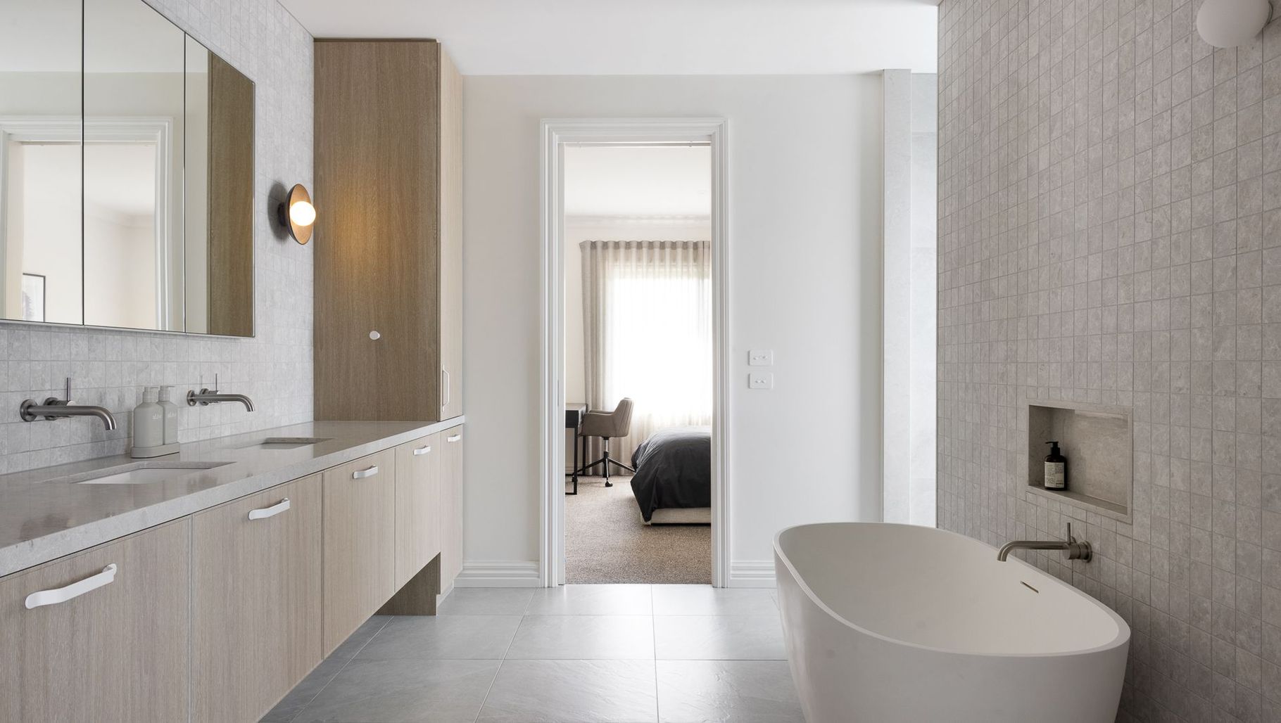 ArchiPro Project Summary - Contemporary sanctuary-style bathroom and laundry design completed in 2023, featuring a cool tonal palette and organic materials that blend classic and modern elements while prioritizing functionality and storage.