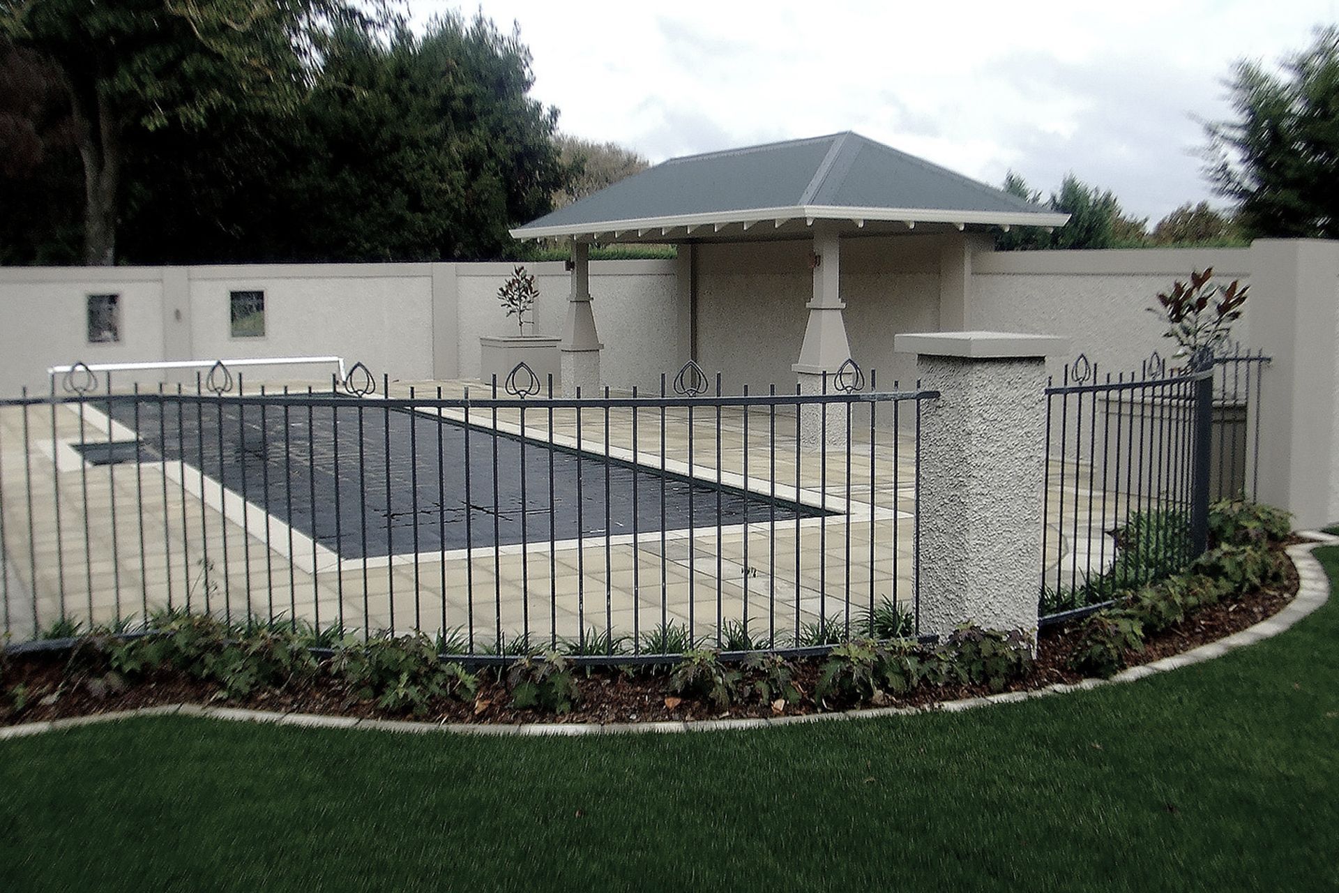 ArchiPro Project Summary - A beautifully designed courtyard pool area and pergola that seamlessly connects a tennis court, inspired by the 1930’s villa with matching details, featuring a solar-heated pool in charcoal plaster and elegant fleur-de-lis motifs in the fencing.