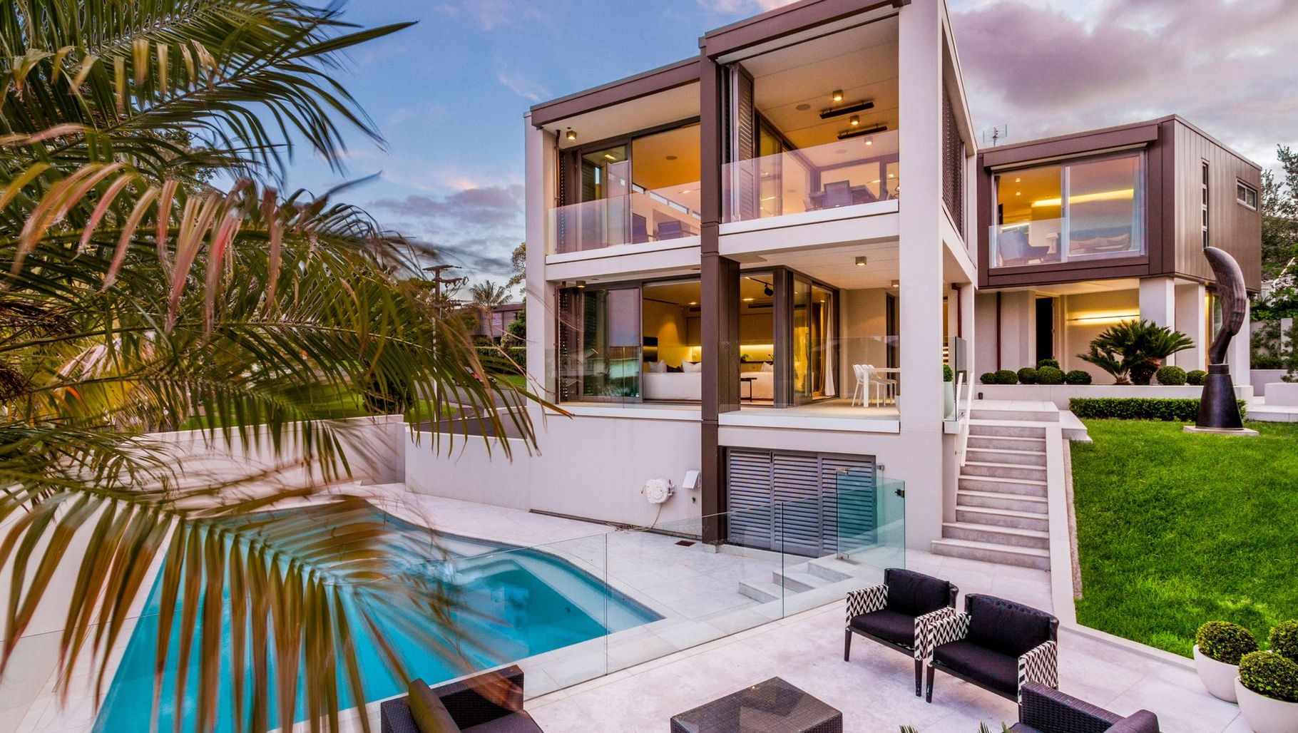 ArchiPro Project Summary - A contemporary three-level home featuring stunning harbour views, spacious living areas, and bespoke details, complemented by a landscaped garden with a pool and patio.