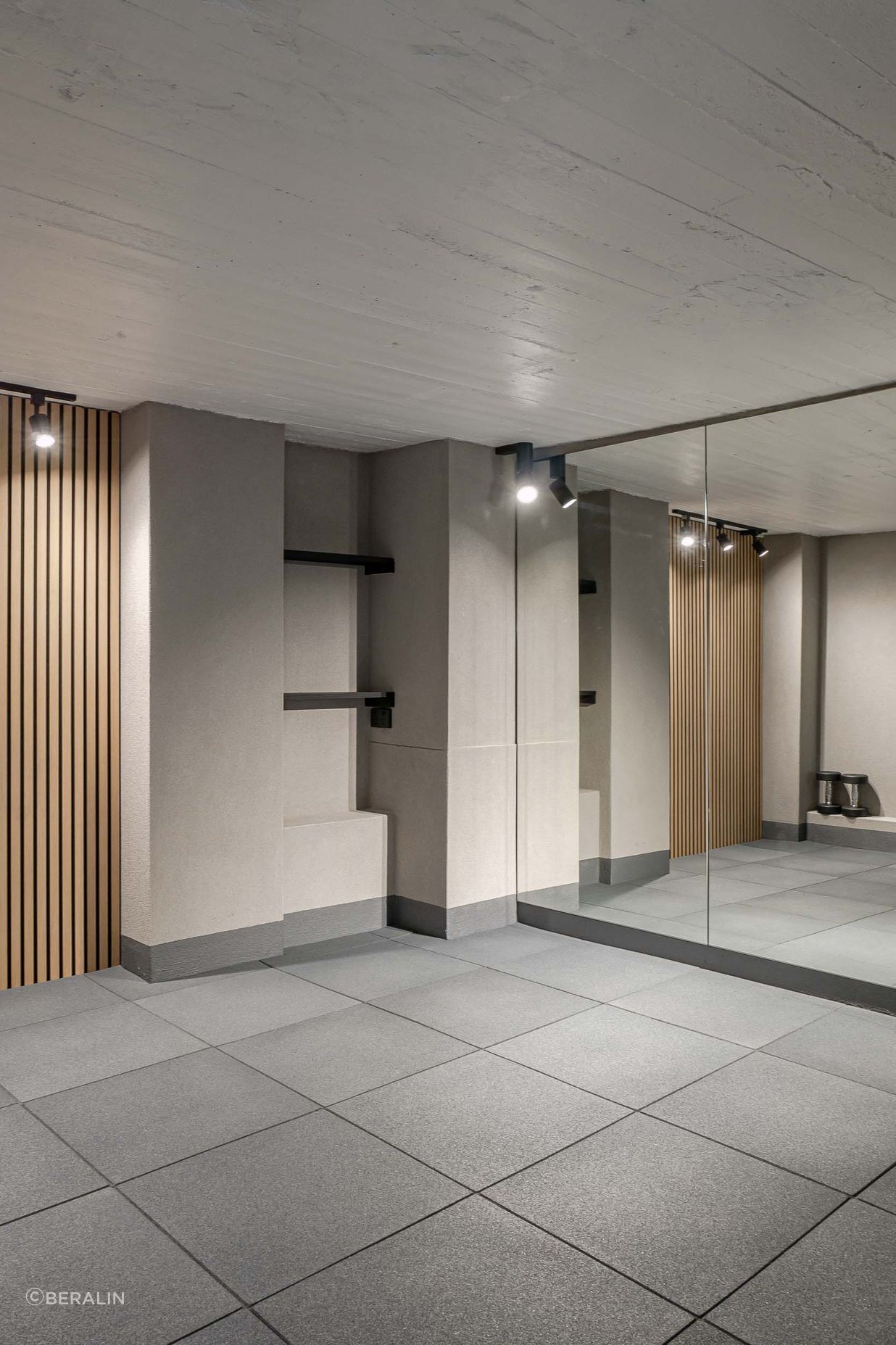 ArchiPro Project Summary - Transforming a basic storage room into a modern home gym, completed in 2024, featuring sophisticated design elements, wooden accents, custom lighting, and high-quality equipment to inspire wellness and motivate fitness goals.