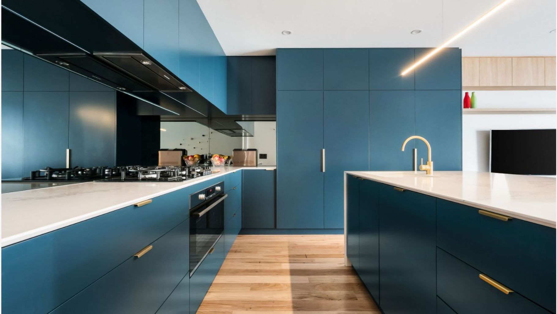 ArchiPro Project Summary - Contemporary kitchen and entertainment unit renovation featuring bold blue cabinetry, timber accents, Caesarstone benchtop, and glass splashback in Camperdown.