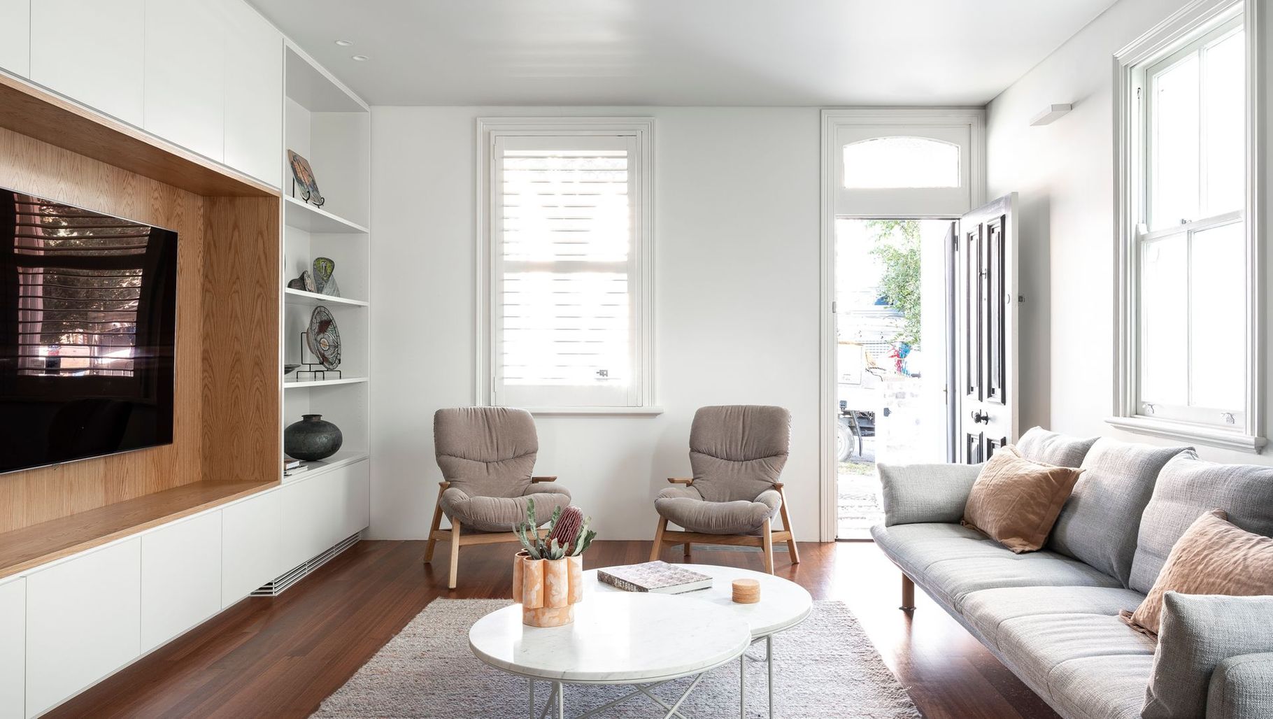 ArchiPro Project Summary - Extensive renovation of a freestanding terrace house, creating distinct family spaces with a monochromatic palette and a focus on light, featuring a large granite island bench as the centerpiece of daily life.