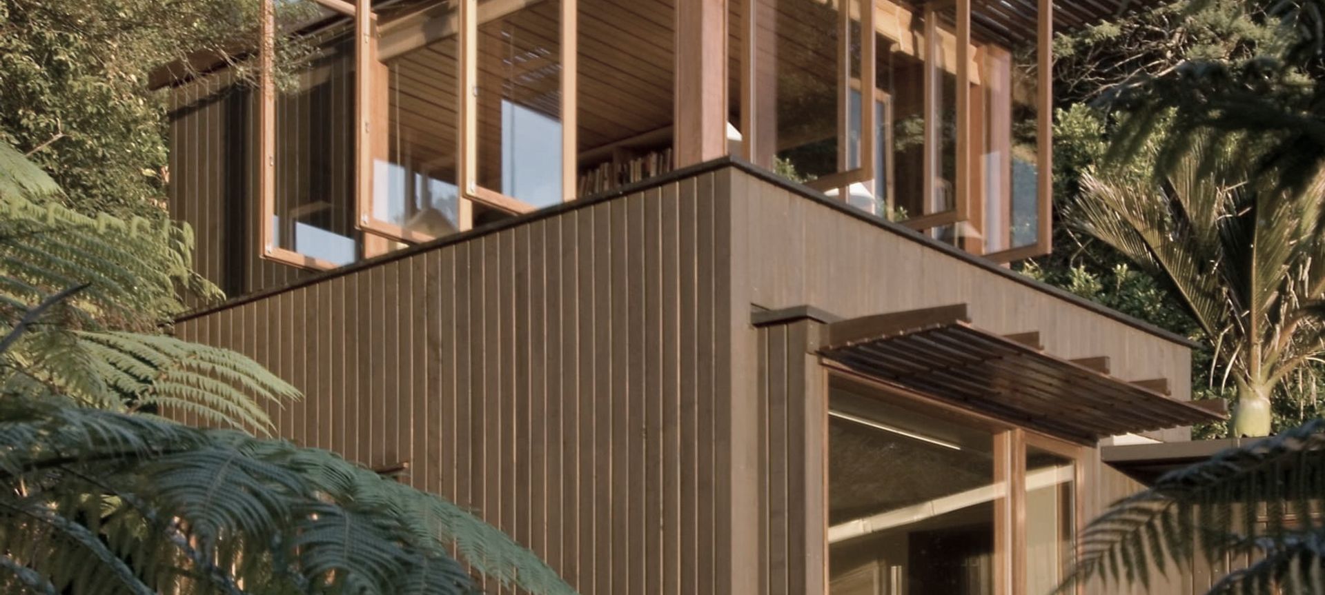 ArchiPro Project Summary - A sustainable family residence in Day's Bay, featuring a harmonious connection to nature, innovative design elements, and a commitment to reusing materials, creating a vibrant space for both living and community events.