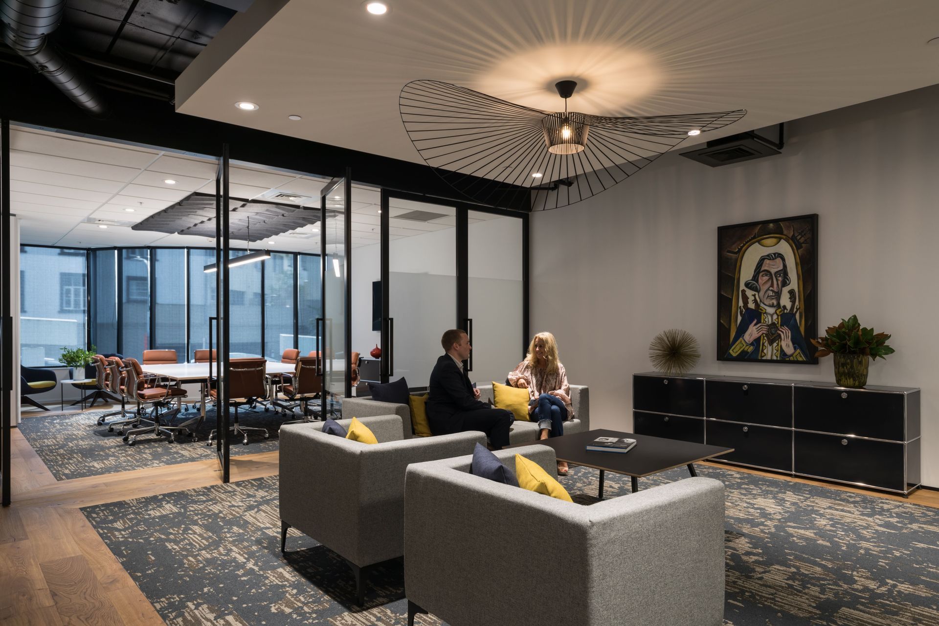 ArchiPro Project Summary - Contemporary corporate workspace designed for a financial services client, featuring adaptable spaces, warm materials, and a sophisticated aesthetic that promotes collaboration and connection.