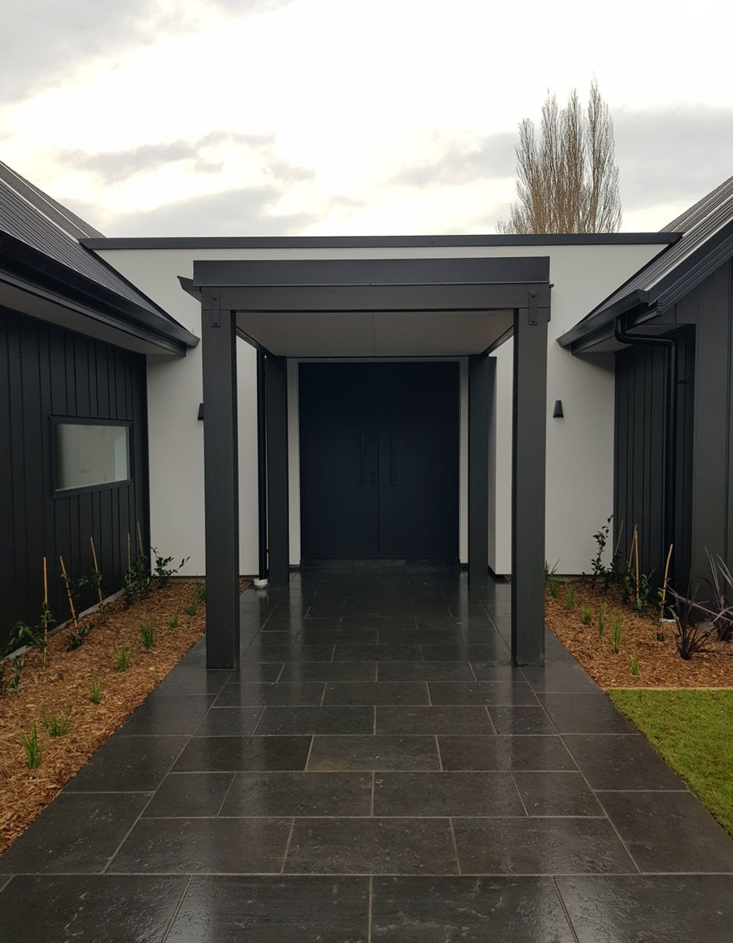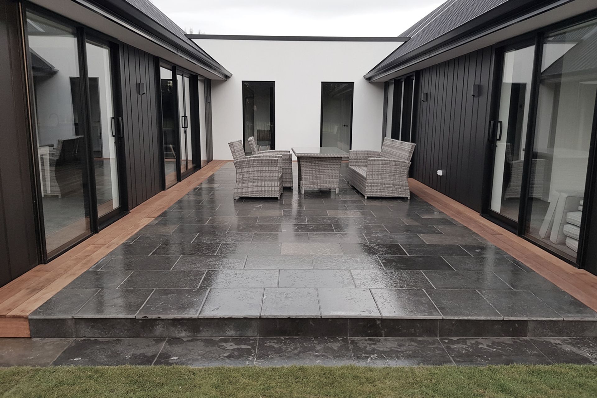ArchiPro Project Summary - Comprehensive site works including natural limestone paving, ModWood decking, Readylawn installation, and complete landscaping for the Casebrook residential project.