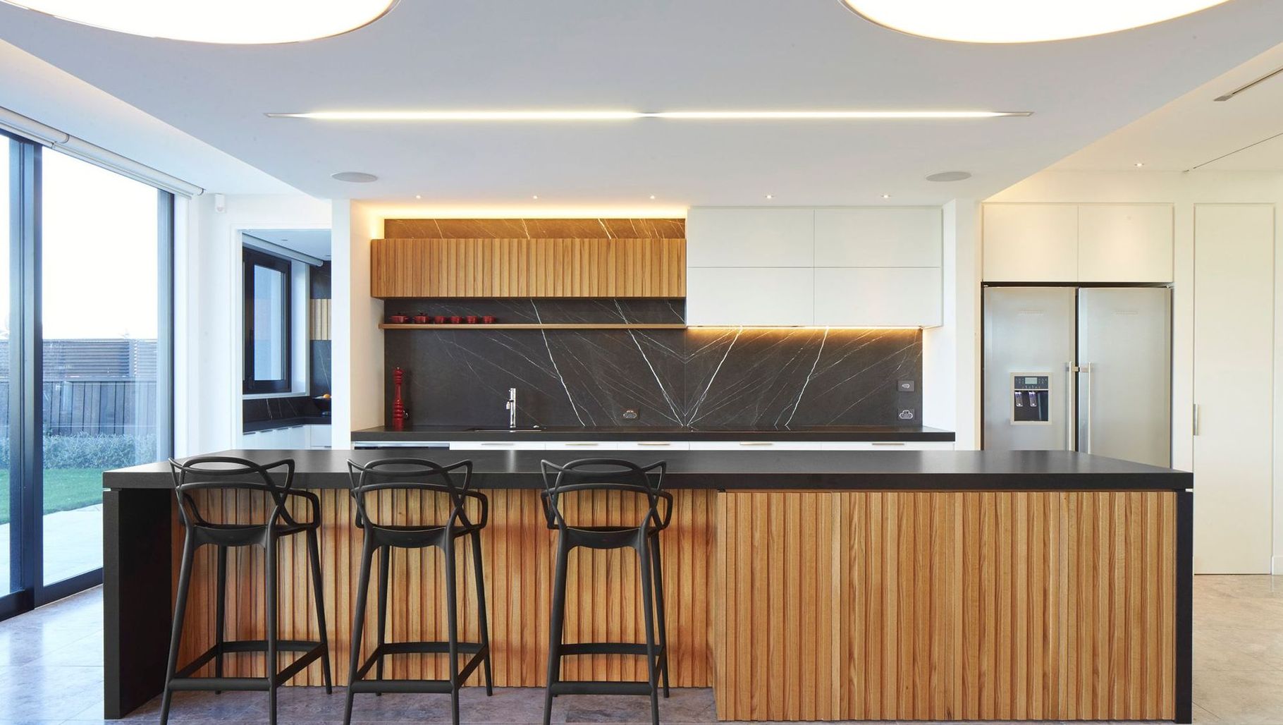 ArchiPro Project Summary - A warm and inviting kitchen featuring Solid American white Oak panelling and Brushed Pietra Marble splashback, complemented by a practical scullery and a spacious island bar for family interaction.