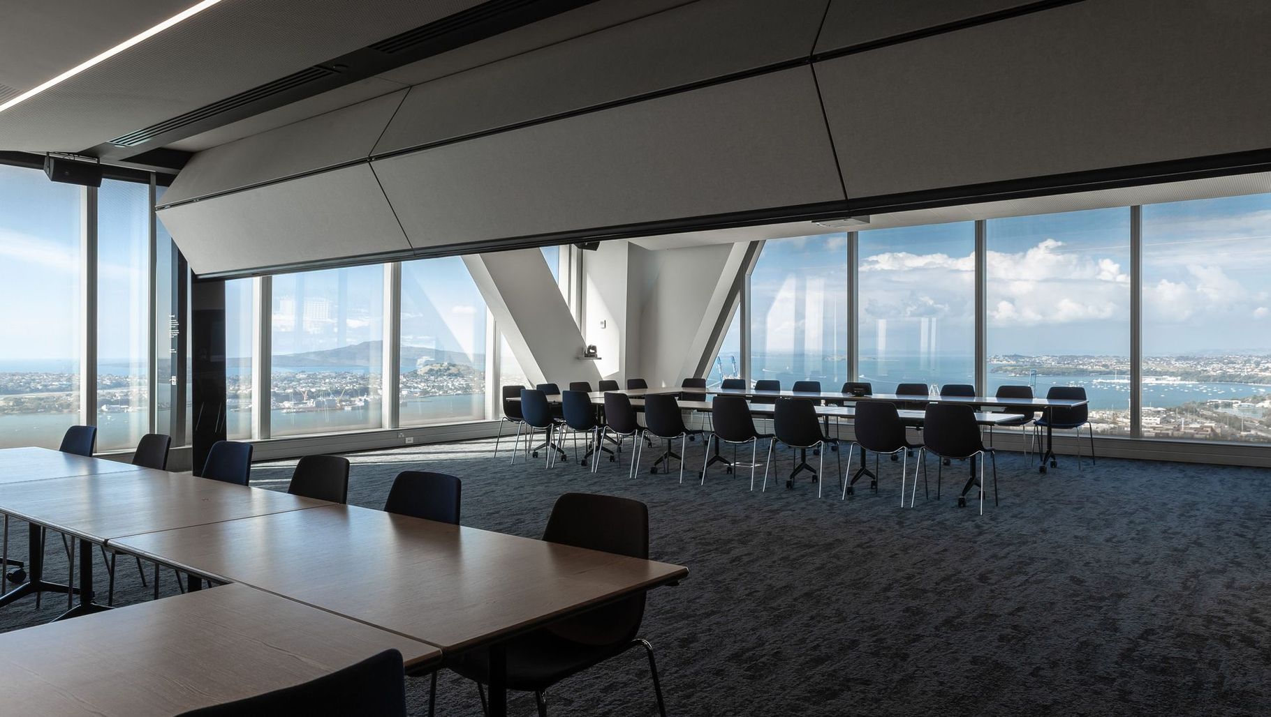 ArchiPro Project Summary - Innovative conference room design for Chapman Tripp featuring the Skyfold Zenith Series, a fully automated vertical retractable acoustic wall, enhancing functionality and aesthetics in the heart of Commercial Bay.