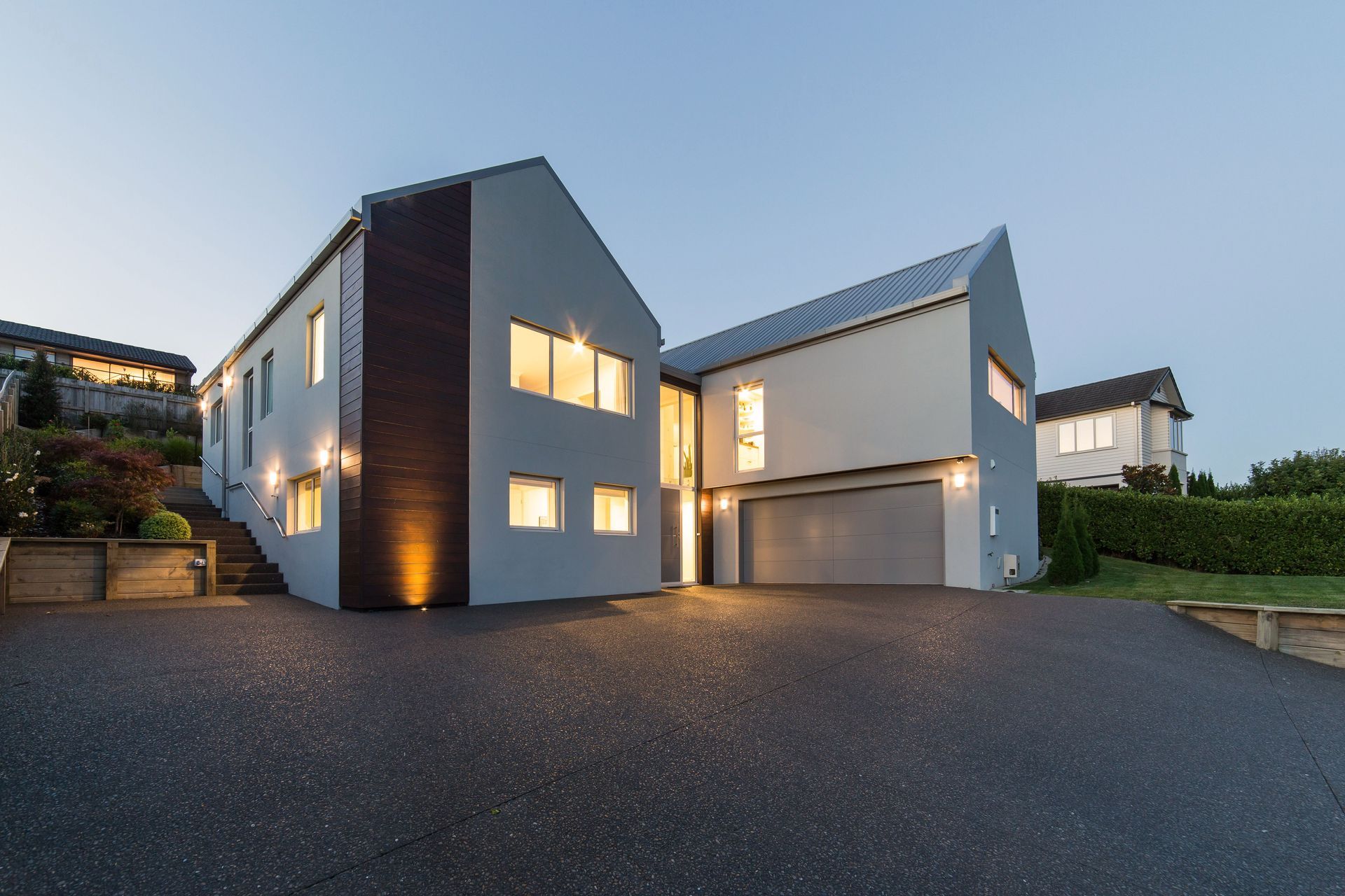 ArchiPro Project Summary - A stunning monolithic plaster residence showcasing European products, harmoniously integrated into a steep hillside, featuring innovative design elements that maximize views and natural light while providing a sustainable and comfortable living environment.