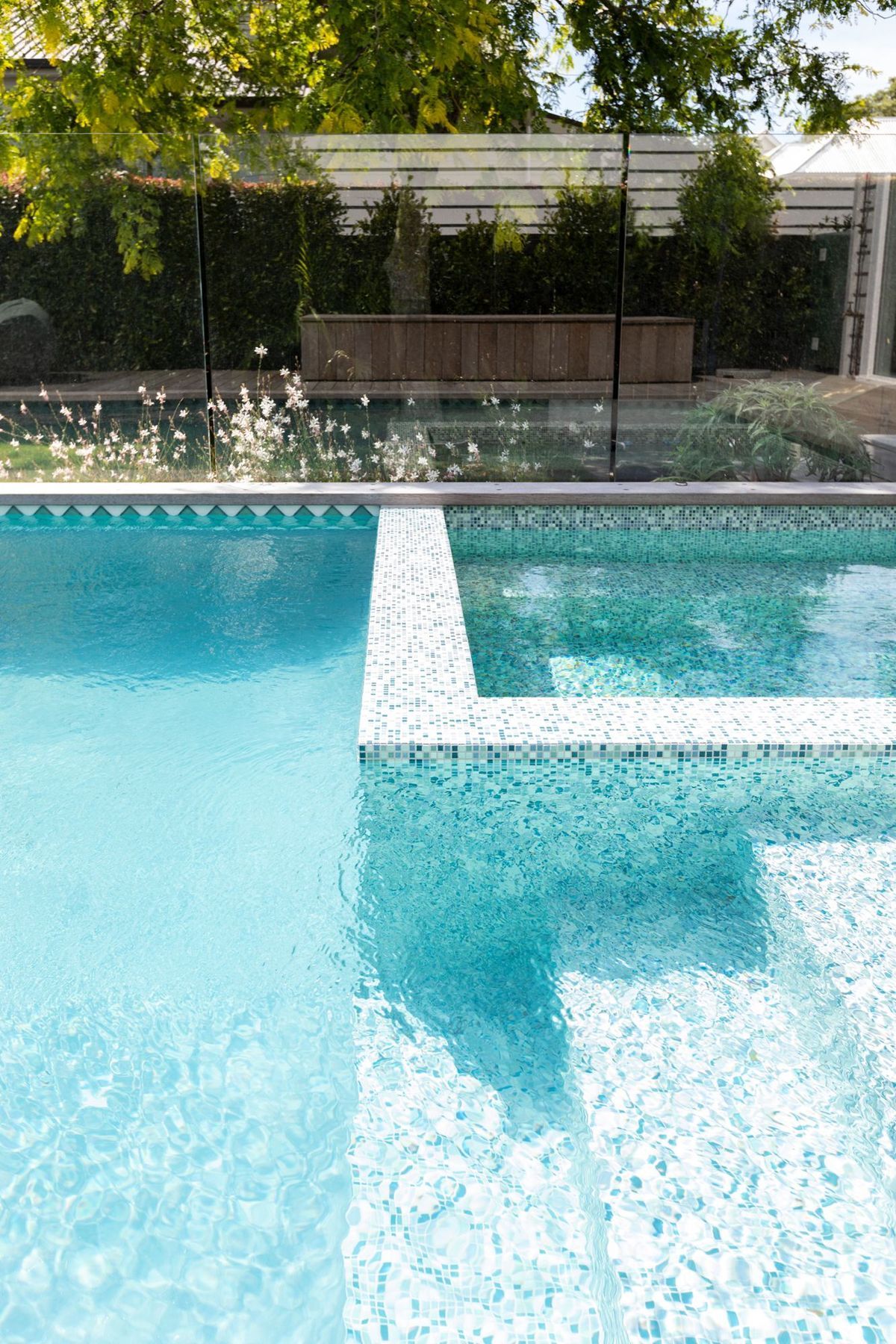 ArchiPro Project Summary - A stunning 13.5m x 4m pool and spa area designed for family gatherings, featuring vibrant tile patterns, a custom plaster blend, an impressive sound system, and layered lighting, seamlessly integrated with a large window for indoor-outdoor enjoyment.