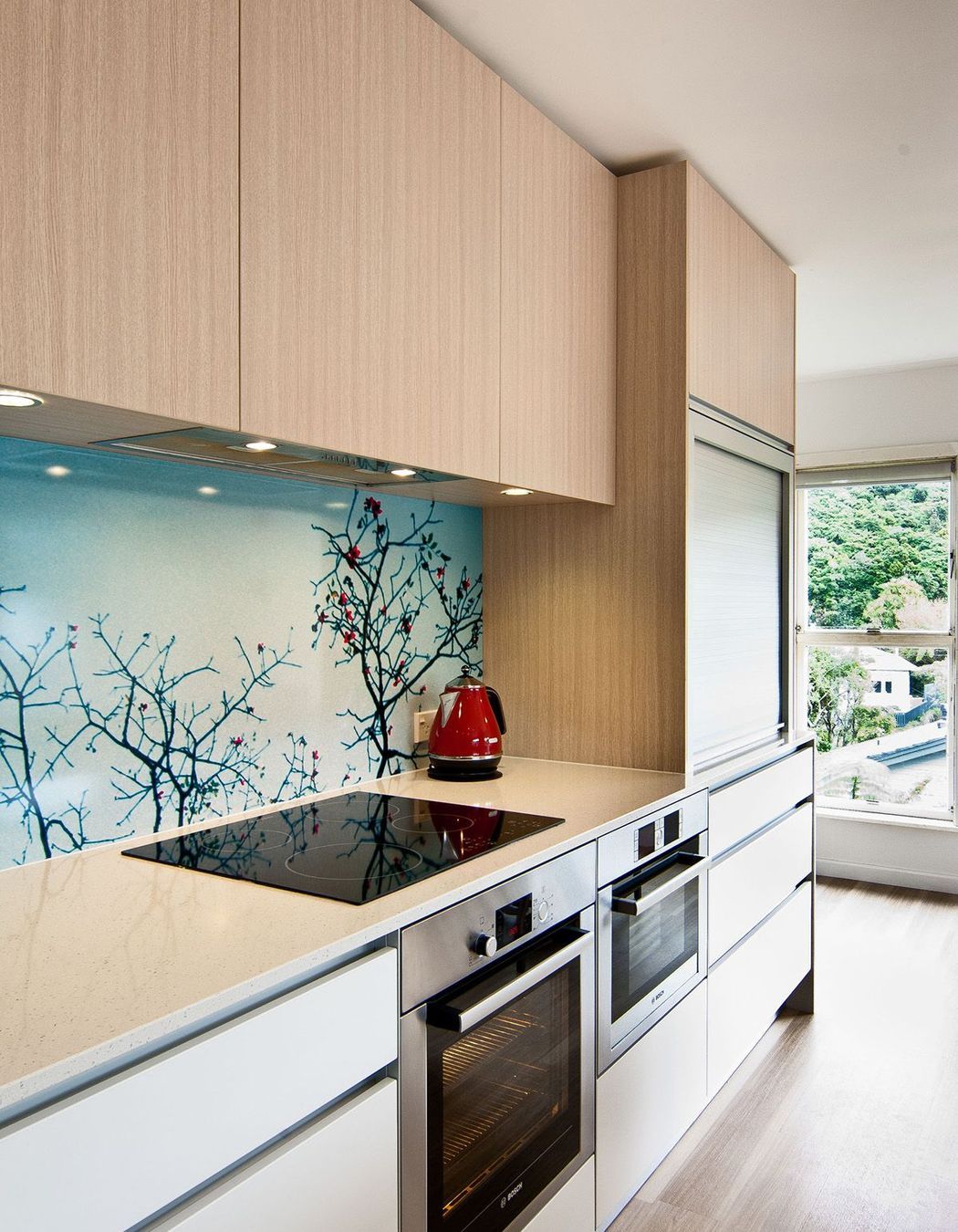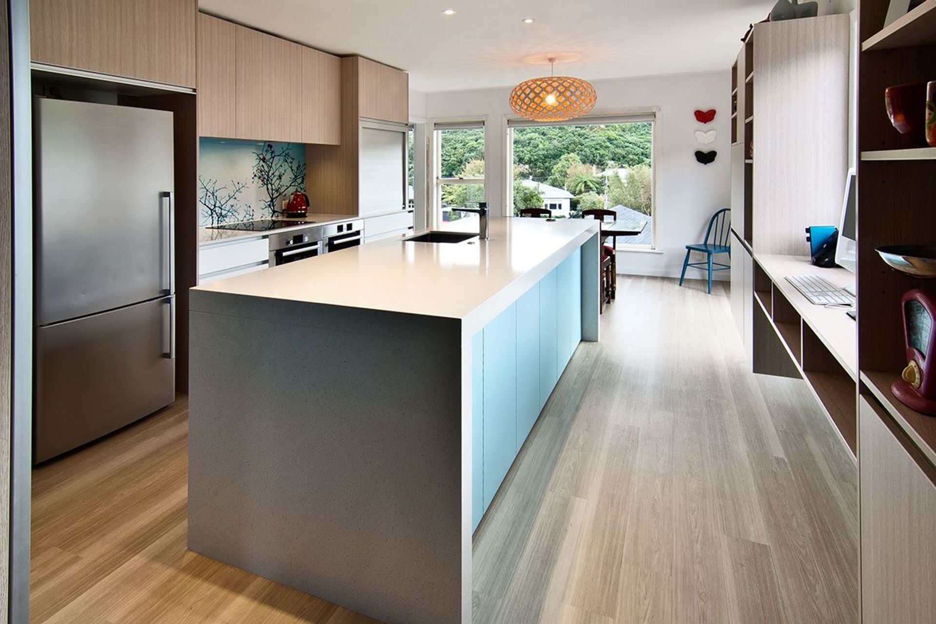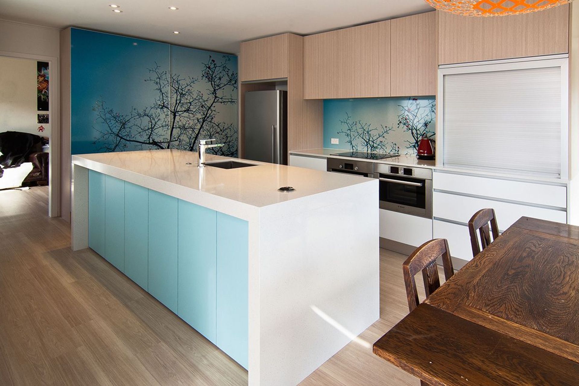 ArchiPro Project Summary - A vibrant kitchen renovation blending personal touches with modern functionality, featuring custom cherry blossom graphics, improved flow, and multi-purpose spaces, all within a budget of NZD$40,000.