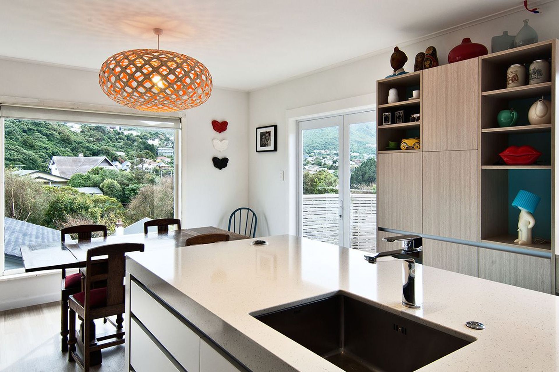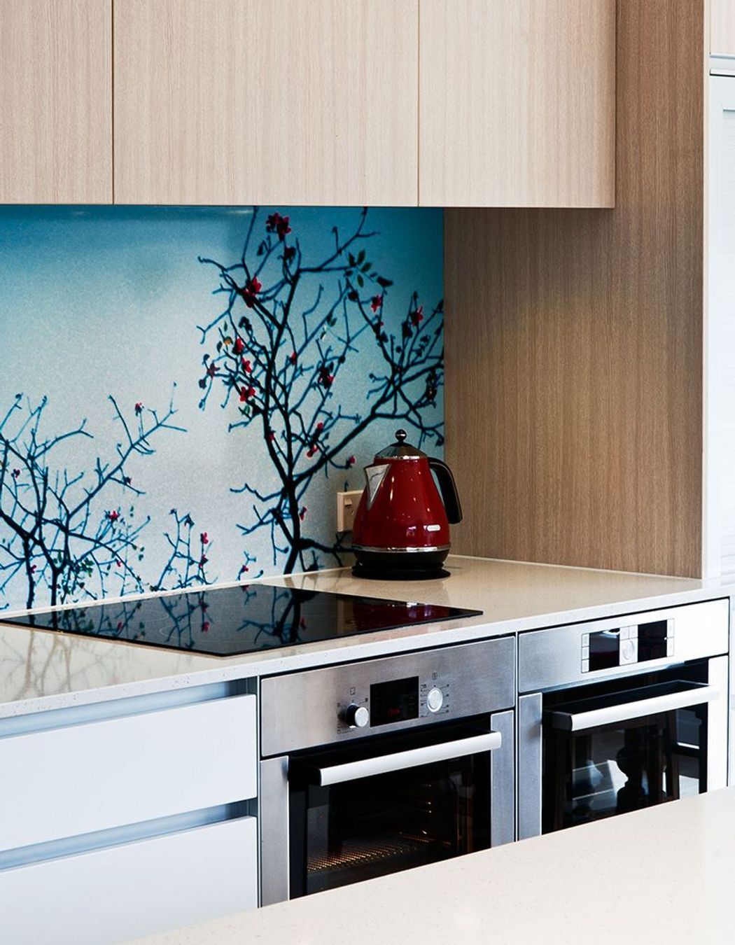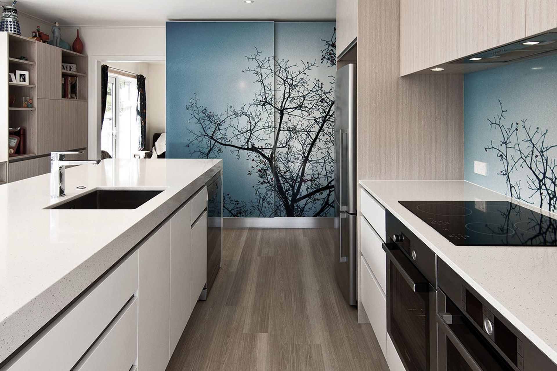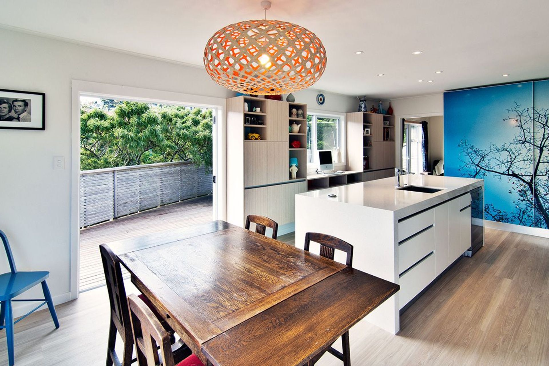 ArchiPro Project Summary - A vibrant kitchen renovation blending personal touches with modern functionality, featuring custom cherry blossom graphics, improved flow, and multi-purpose spaces, all within a budget of NZD$40,000.