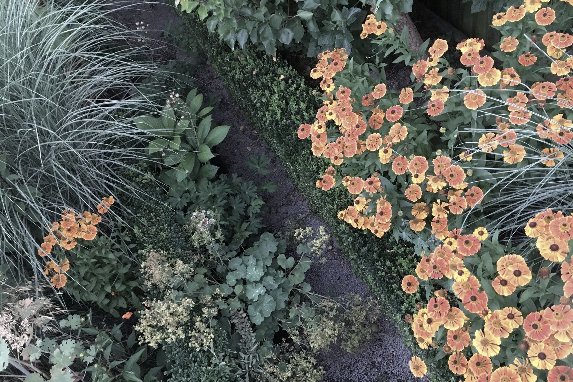 ArchiPro Project Summary - A thoughtfully designed suburban garden featuring clipped hedging, a diverse array of flowering perennials, ornamental grasses, and small trees, celebrating the beauty of all four seasons.