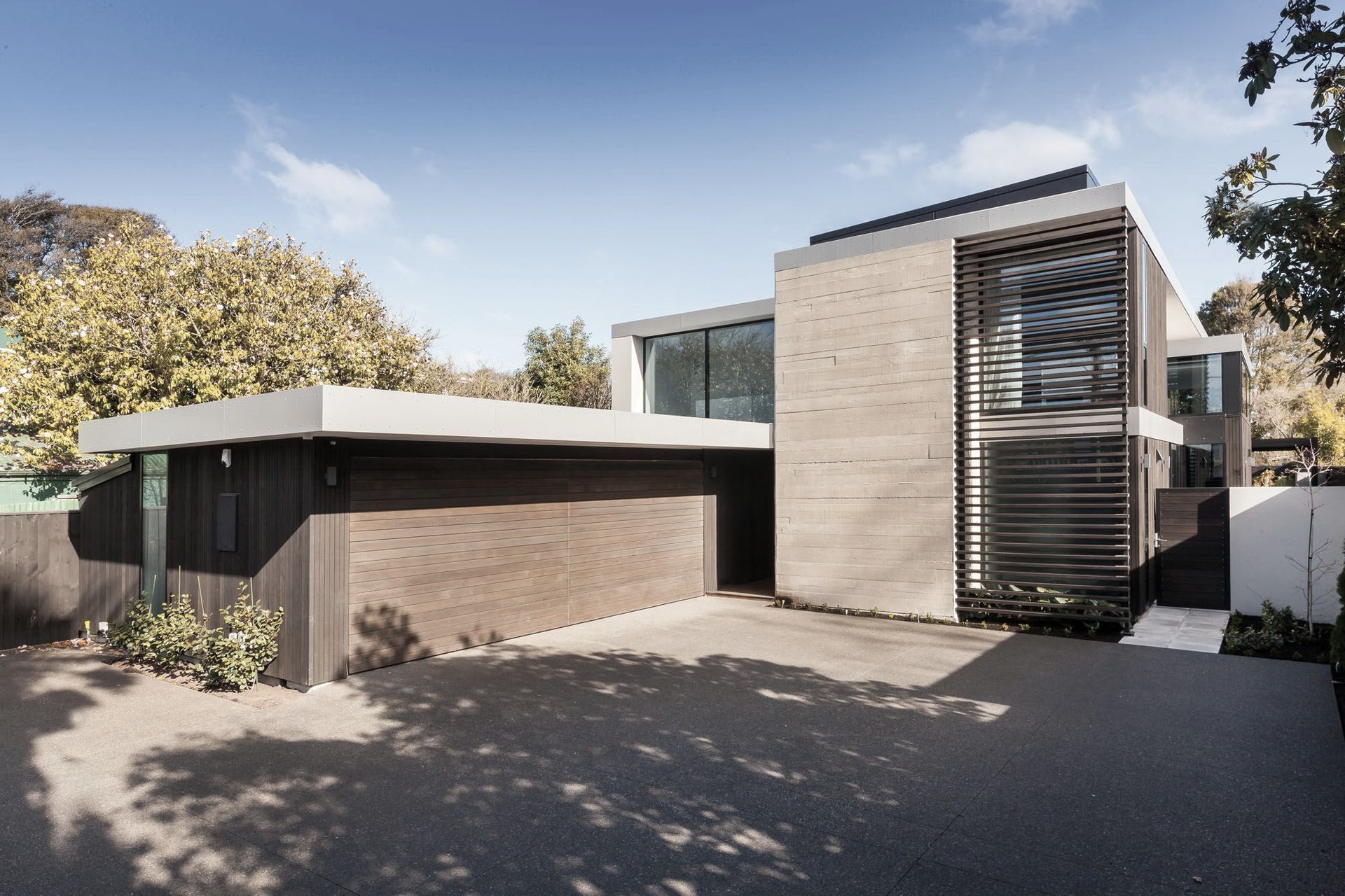 ArchiPro Project Summary - The Christchurch House showcases modern architecture with elegant siding and a spacious driveway, surrounded by lush trees for a tranquil atmosphere.