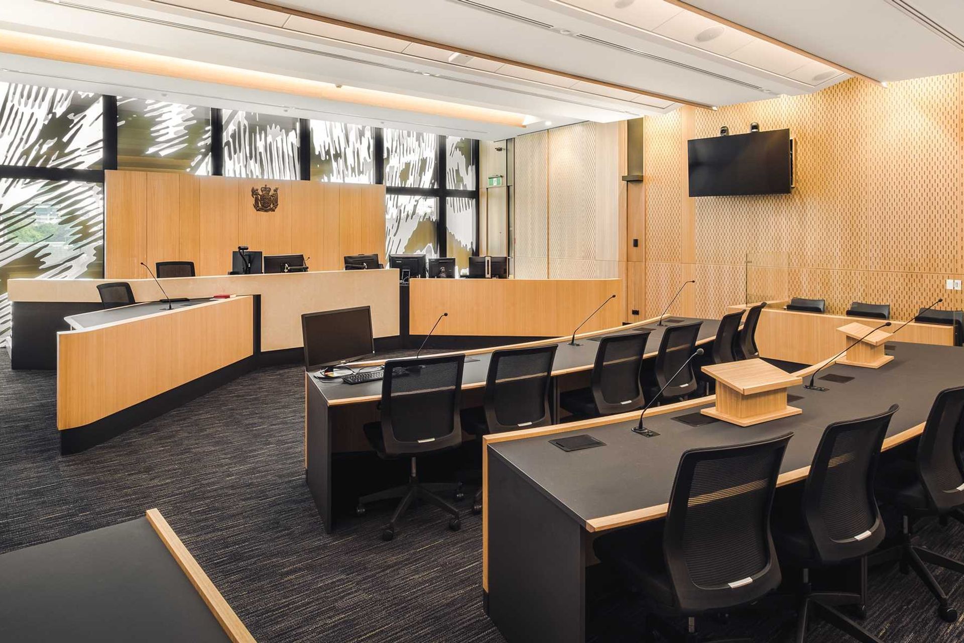 ArchiPro Project Summary - Christchurch Justice Precinct showcases exquisite Eucalyptus Ash veneer in wall and ceiling panelling, along with courtroom furniture and cabinetry, enhancing the space with fire-retardant natural MDF panels and decorative perforated patterns.