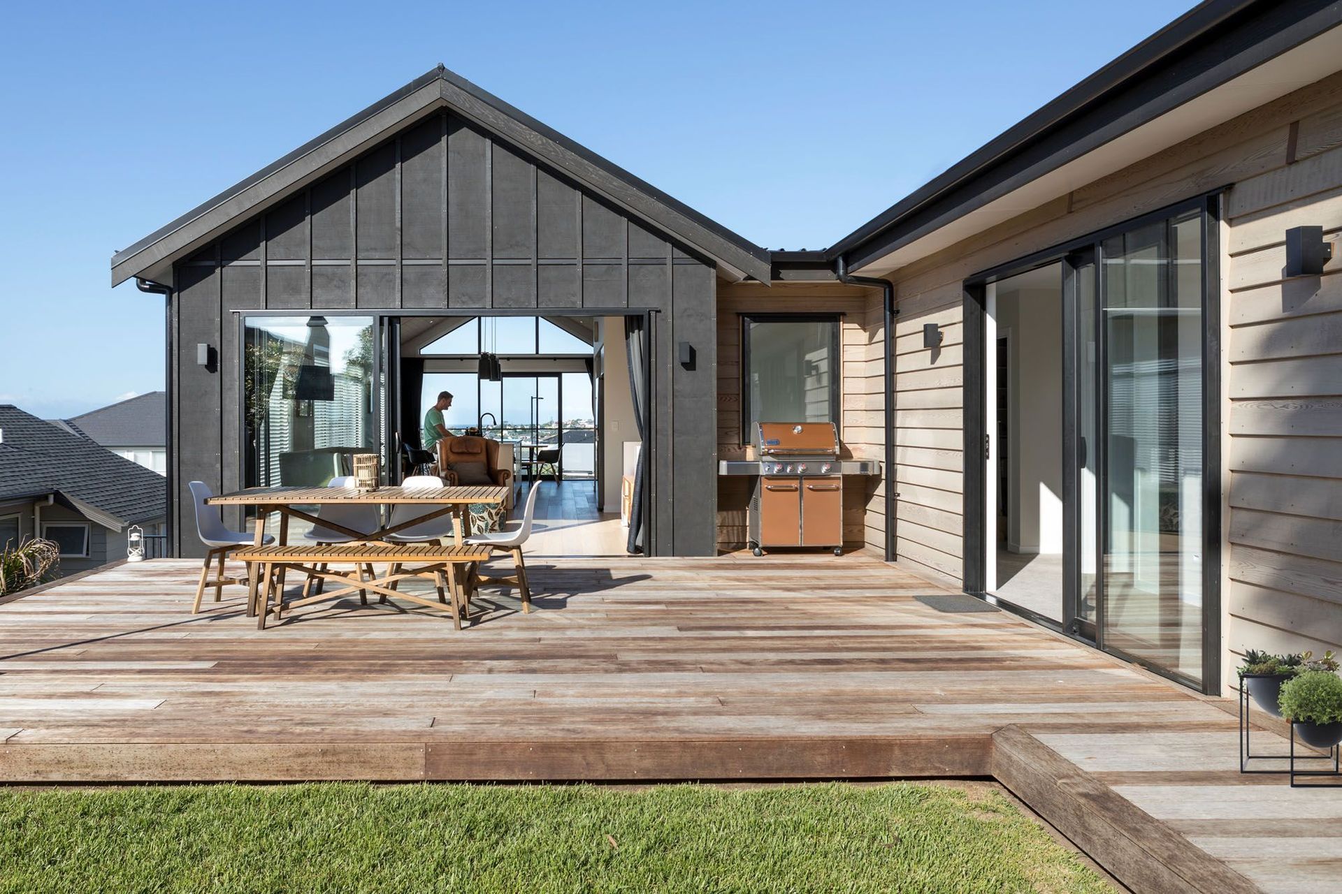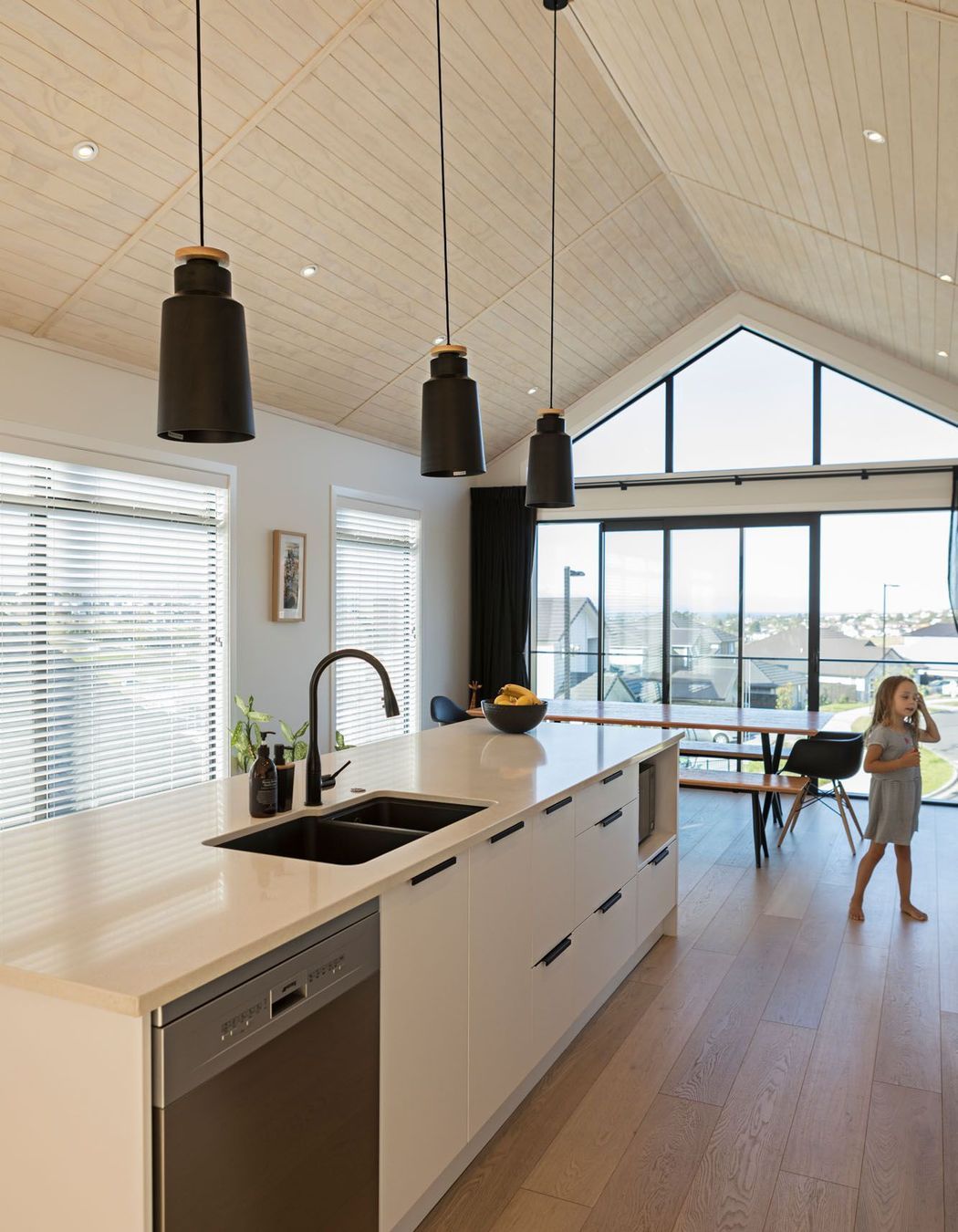 ArchiPro Project Summary - A thoughtfully designed two-story home built into the slope to maximize sea views, featuring a traditional build with contemporary styling and a stunning cathedral ceiling throughout the open-plan living and kitchen area.