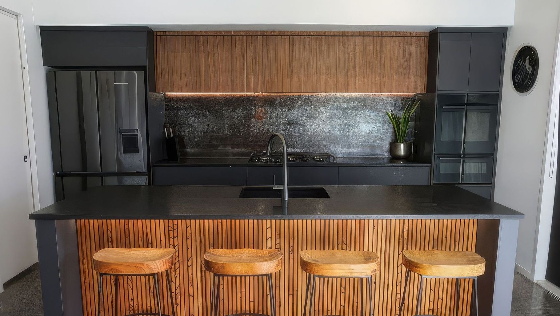 ArchiPro Project Summary - A moody kitchen design featuring dramatic LED strip lighting that highlights American White Ash detailing, complemented by a sophisticated palette of cinder, anthracite, and black pearl finishes.