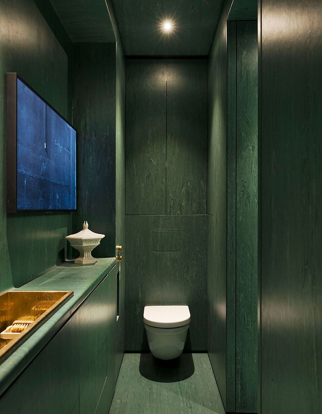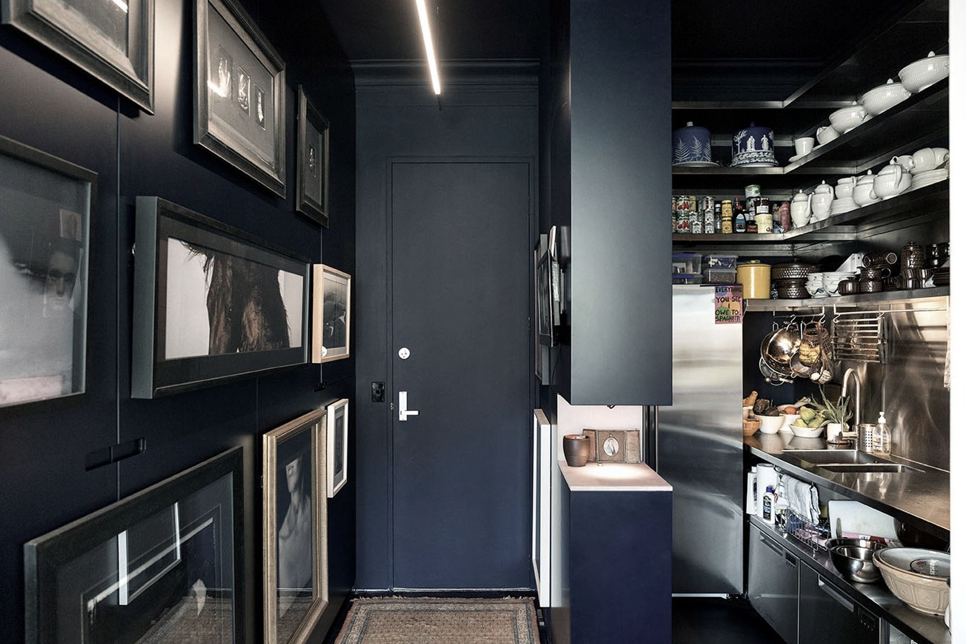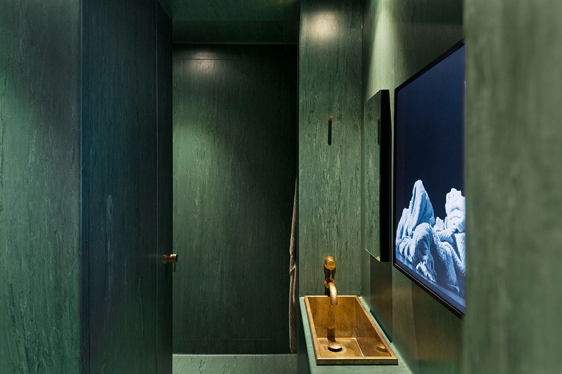 ArchiPro Project Summary - Conceptual and unique downtown apartment featuring a functional kitchen, dedicated art space, and a distinctive wet room with brass detailing and a dynamic art piece.