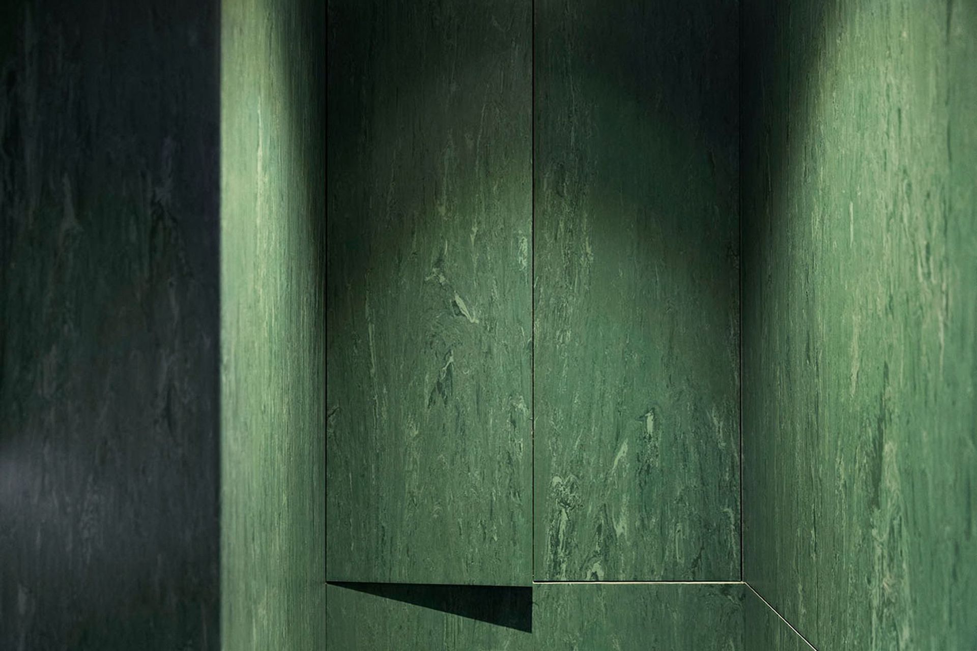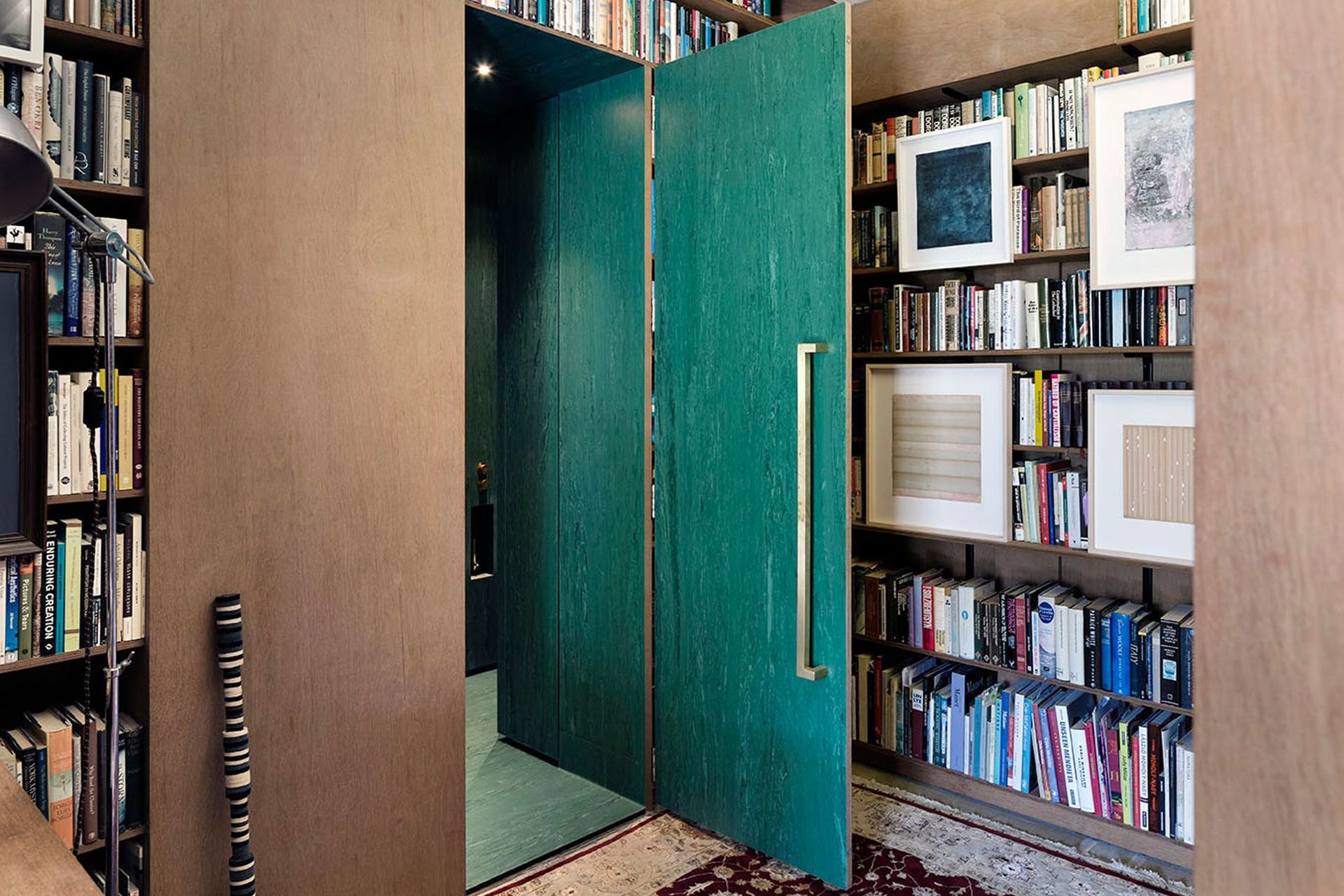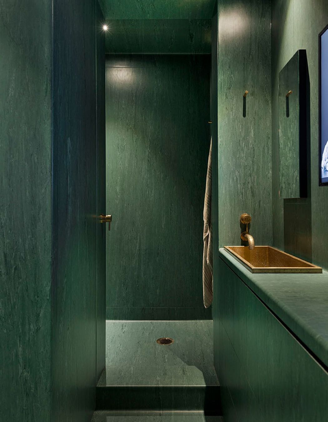 ArchiPro Project Summary - Conceptual and unique downtown apartment featuring a functional kitchen, dedicated art space, and a distinctive wet room with brass detailing and a dynamic art piece.