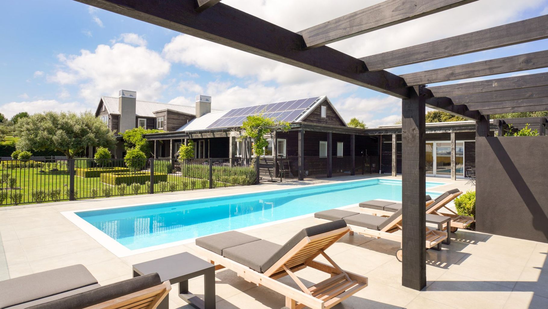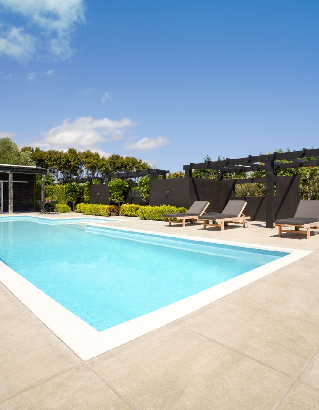 ArchiPro Project Summary - A beautifully designed outdoor pool area by Buka Woods, featuring Peter Fell coloured concrete, complemented by expert craftsmanship from Inground Pools Ltd and RGC, with a solar heating system by Sunbather Pool Solar Heating NZ and elegant balustrade by Glass Vice Products Ltd.