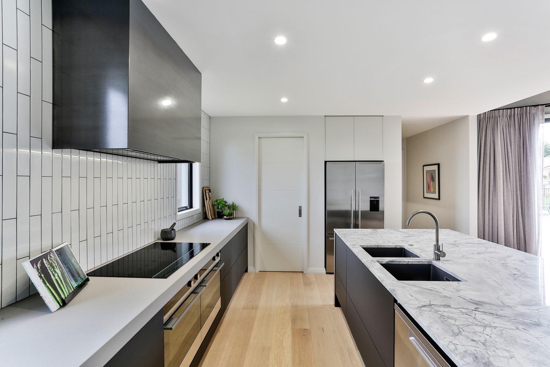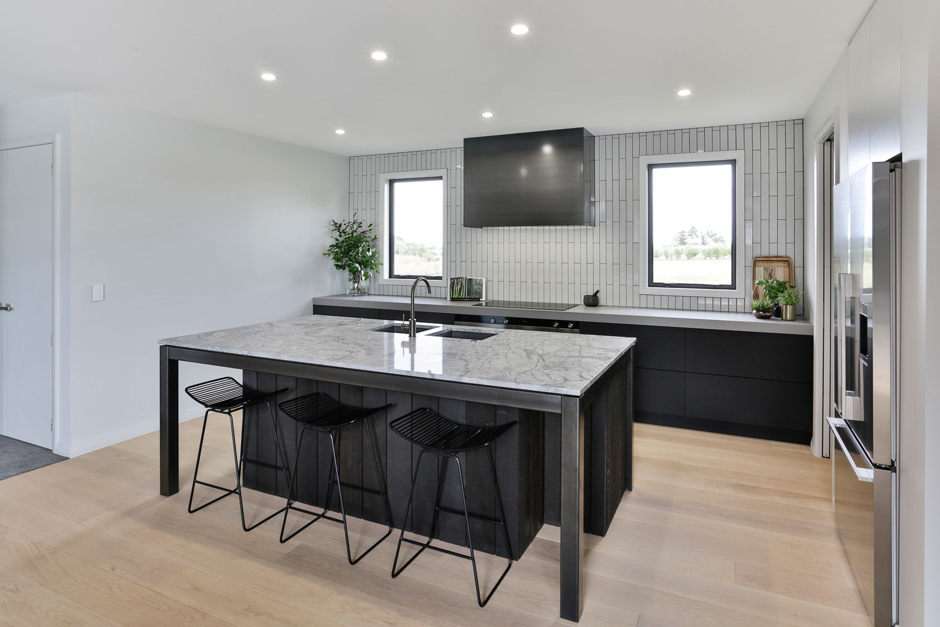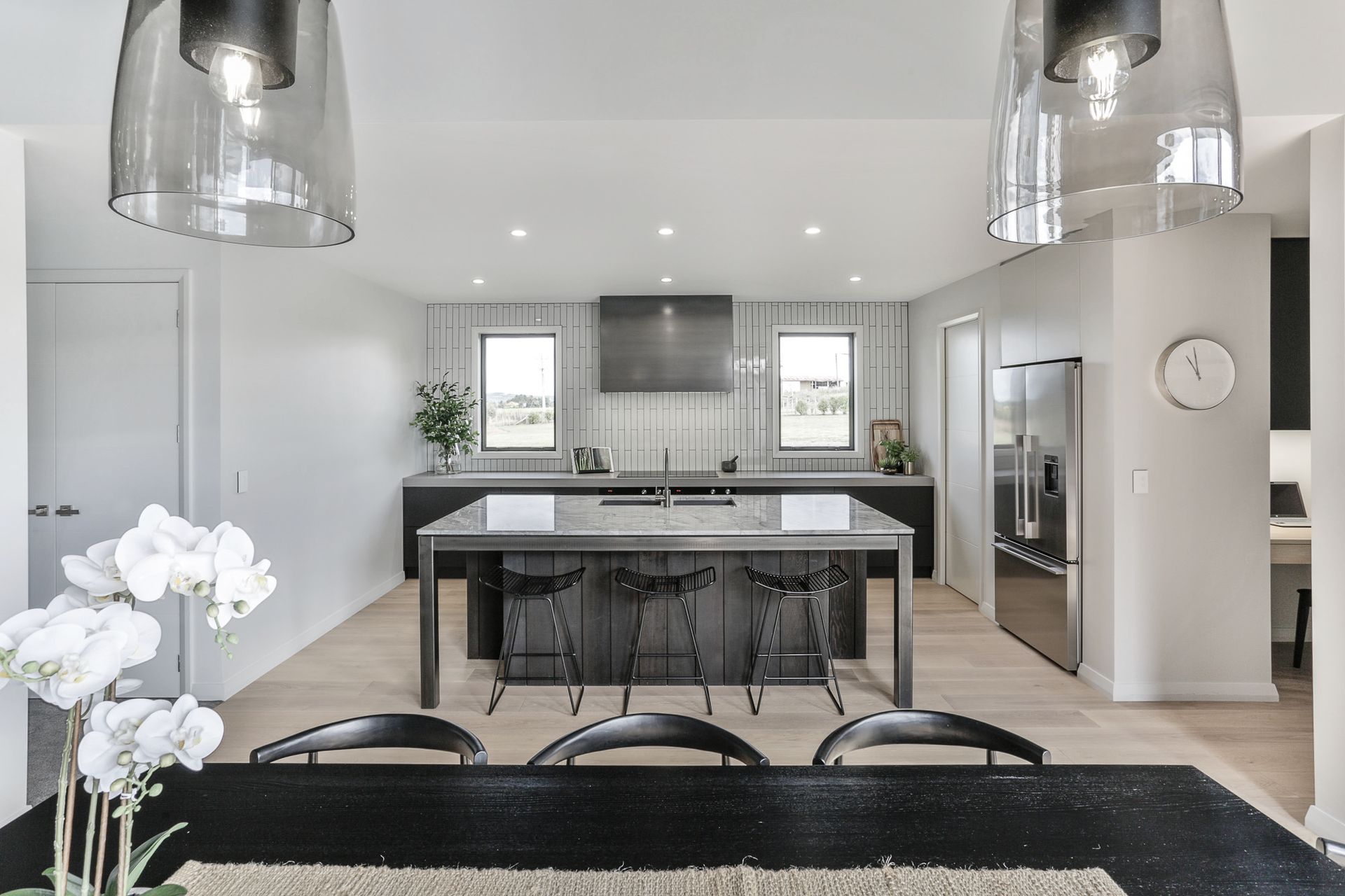 ArchiPro Project Summary - Jericho: A 2018 architectural masterpiece featuring floor-to-ceiling windows, spacious bedrooms for privacy, and a luxurious kitchen designed in collaboration with Carlielle Kitchens, all set against a stunning rural landscape.