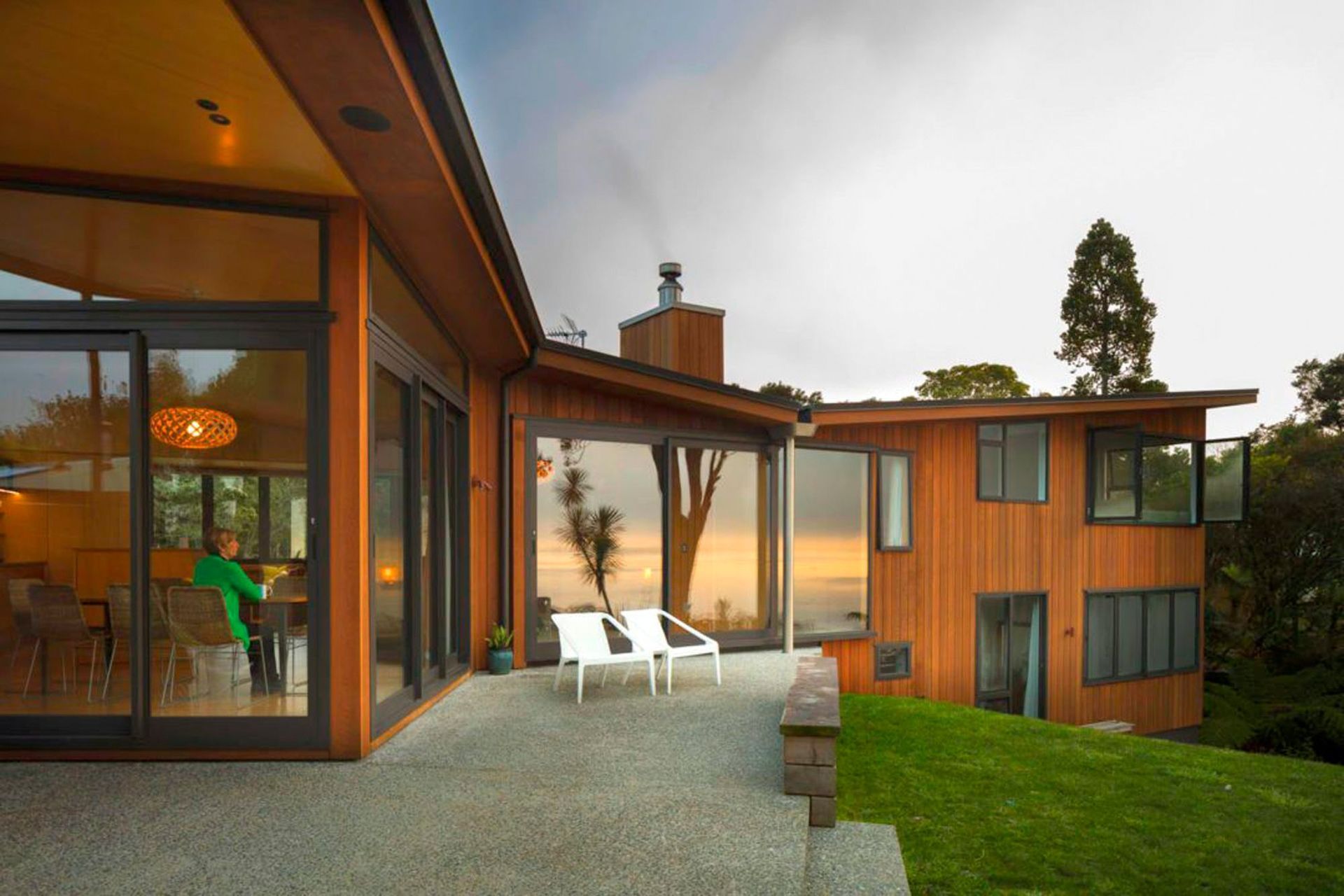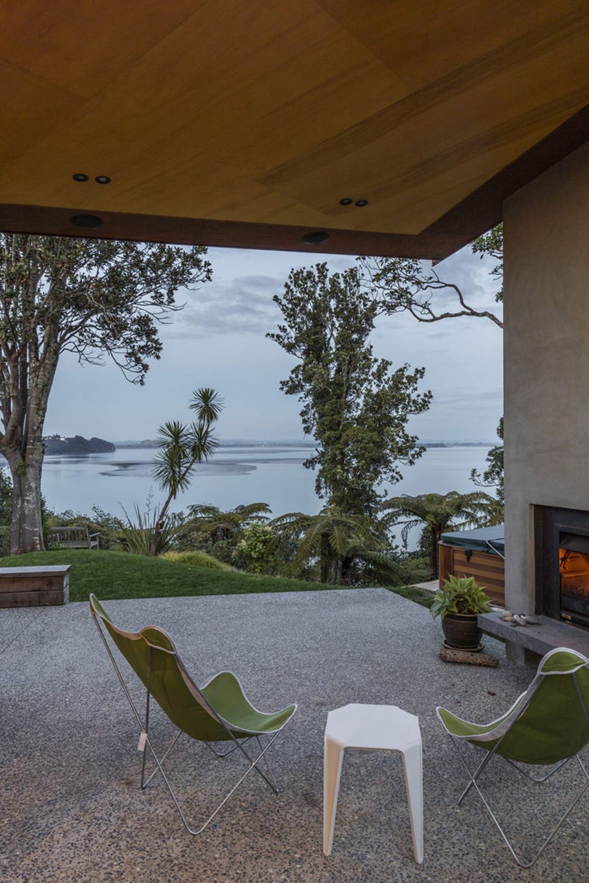 ArchiPro Project Summary - A mid-century inspired home featuring a gullwing roof, curved stone planters, and a concrete patio, designed to maximize stunning views of the Manukau while harmonizing with the surrounding cliffside neighborhood.
