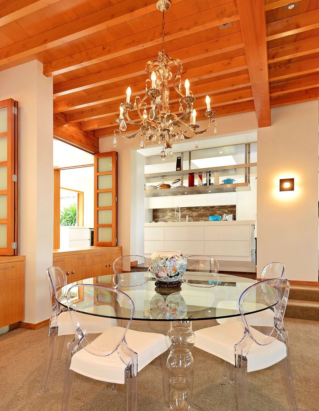 ArchiPro Project Summary - A comprehensive upgrade of a clifftop architectural design featuring a modern kitchen with a striking hanging metal structure, seamlessly connecting the lounge, dining, and kitchen areas for an open and contemporary living space.