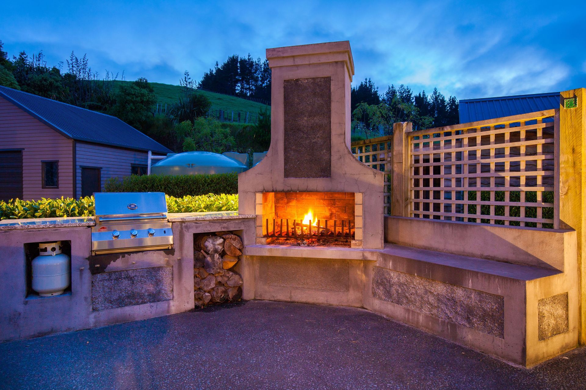 ArchiPro Project Summary - A grand American country style estate in Oakura, featuring sophisticated Hamptons elegance, expansive indoor/outdoor living spaces, and stunning countryside views, complete with an outdoor entertaining area, fireplace, barbecue, and spa bath.