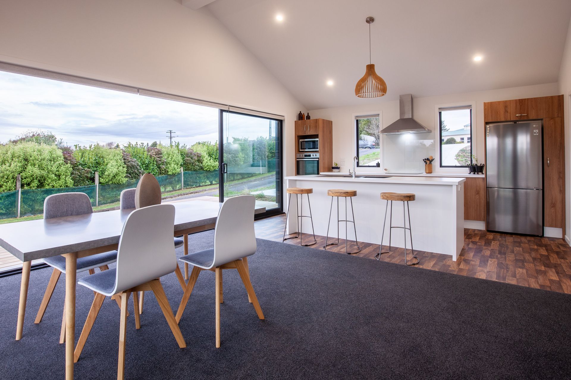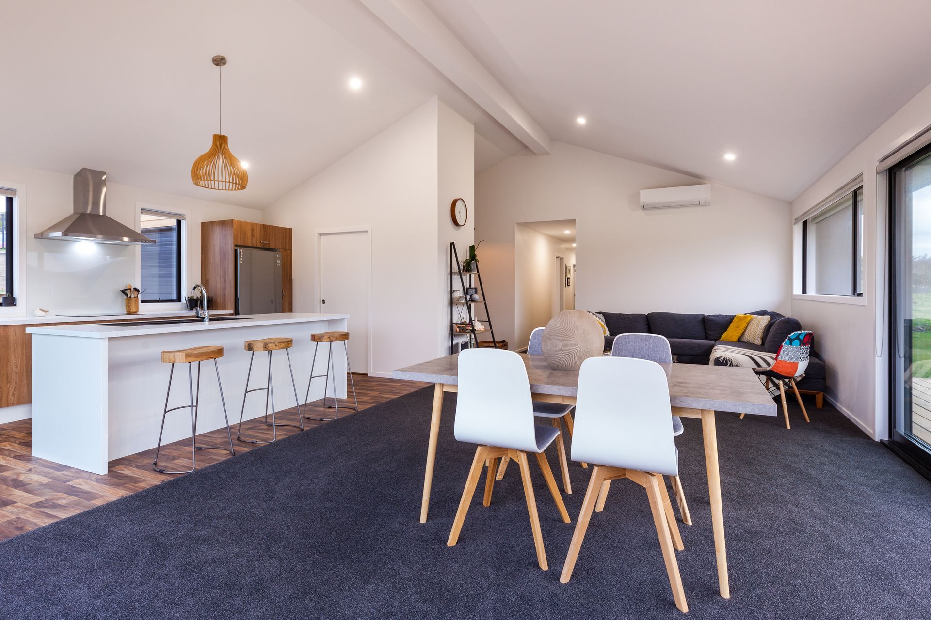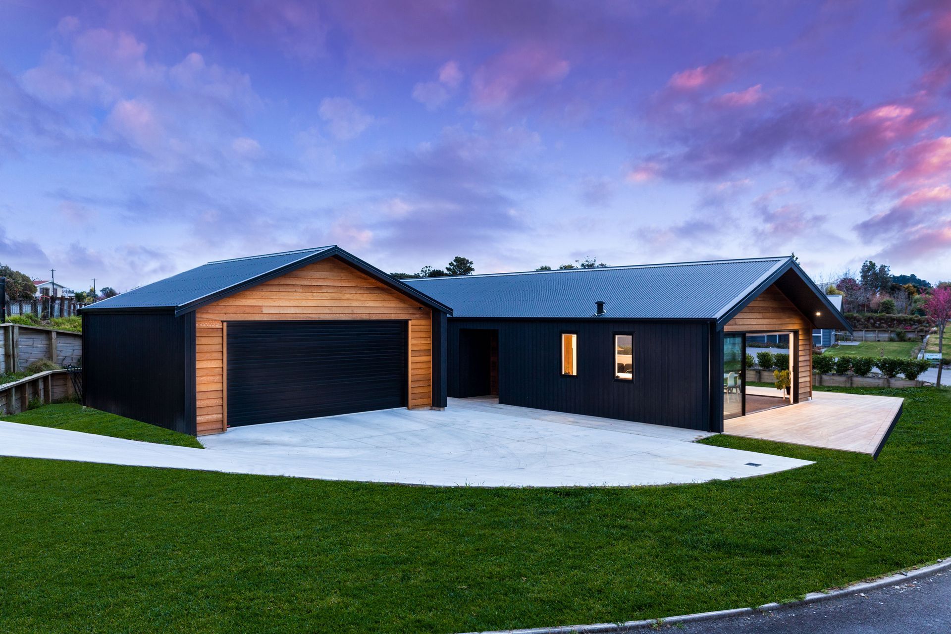 ArchiPro Project Summary - Affordable coastal home in Urenui featuring open-plan living, full-height sliding doors, and a separate double garage, designed to complement the relaxed lifestyle of northern Taranaki.